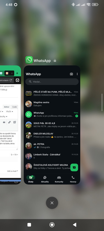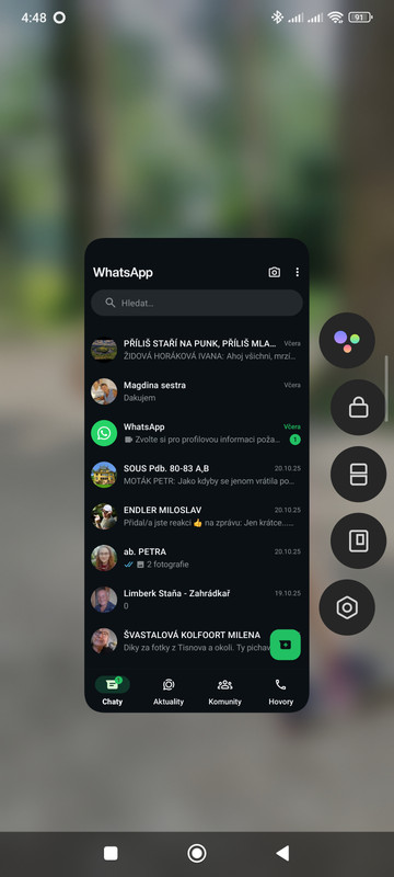 Nyní obě aplikace spusťte. Pak klikněte na spodní levou kontextovou klávesu čtverečku. Záhy se dostanete do Správce spuštěných aplikací. Uvidíte zde dvě „okna“ spuštěných appek WhatsApp a Gmail. Teď ma okně každé appky podržte dlouze prst až vám na boku okna vyskočí nabídka možností. V nabídce kliknrete na ik9nu malého visacího zámečku, čímž appku „uzamknete“ a tím pádem zamezíte systému, aby s ní cokoli dělal. Bude stále spuštěna na pozadí a měla by vám tak poskytovat zvukové notifikace při nové došlé zprávě / emailu.