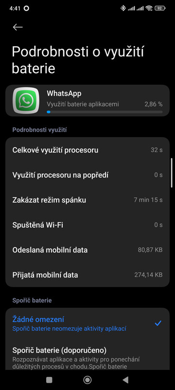 Vlezte do „Podrobnosti o aplikaci“ u každé z nich a tu rozklikněte položku „Baterie“ a tu v sekci „Spořič baterie“ (psáno šedě) zakliněte volbu „Žádné omezení“