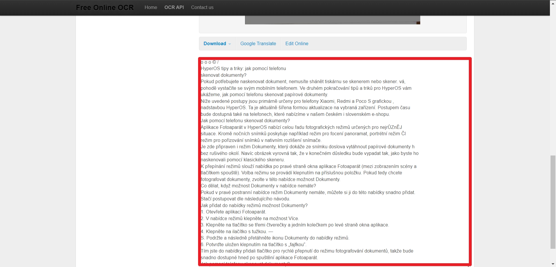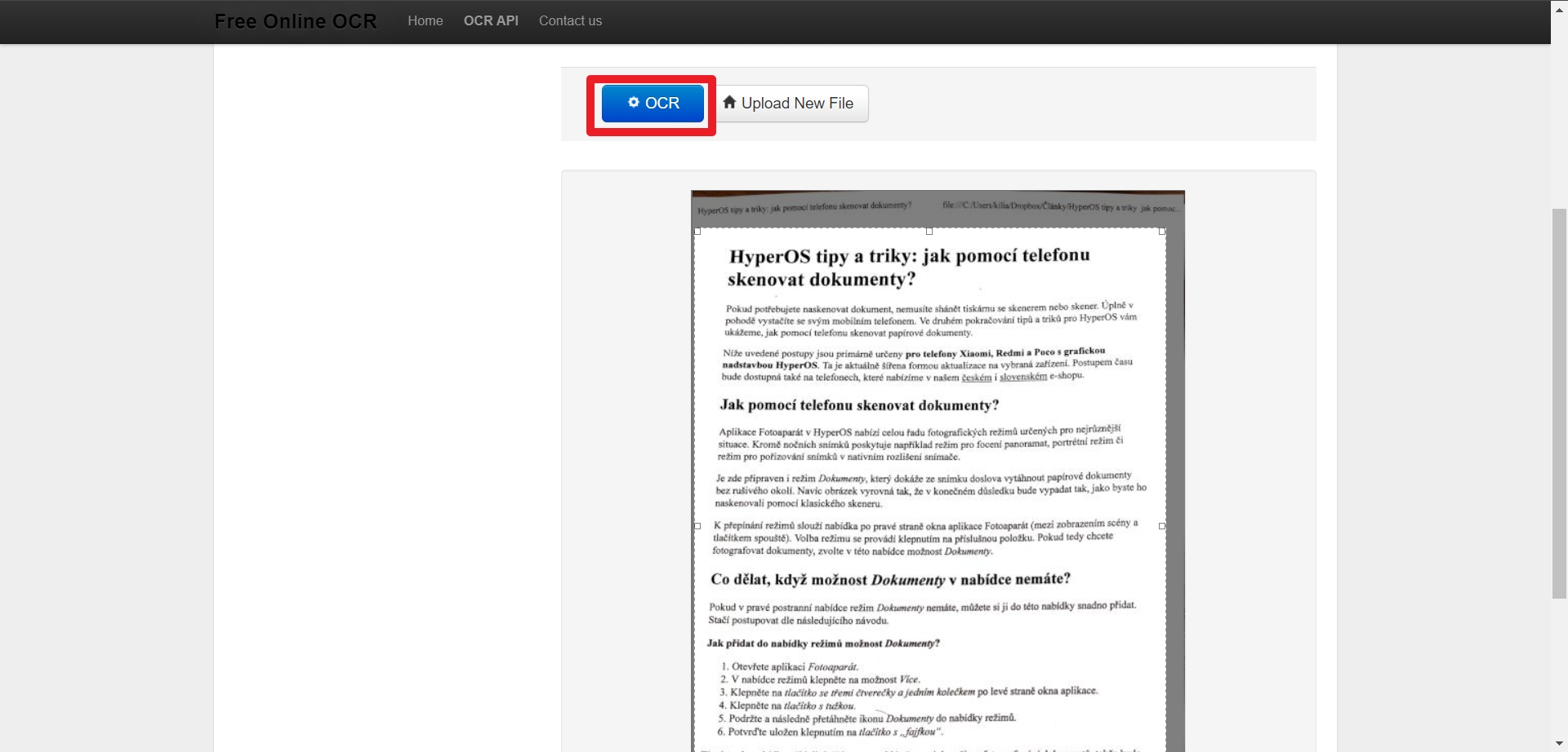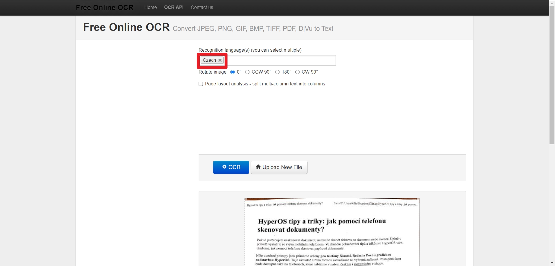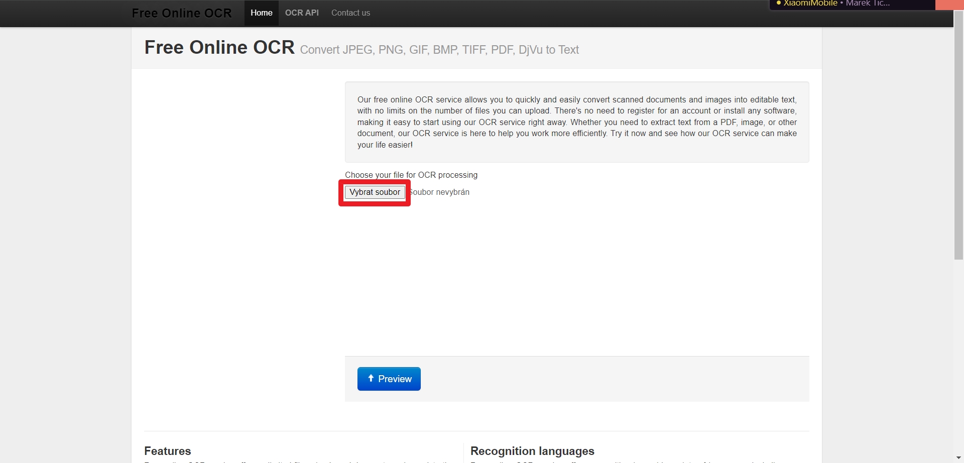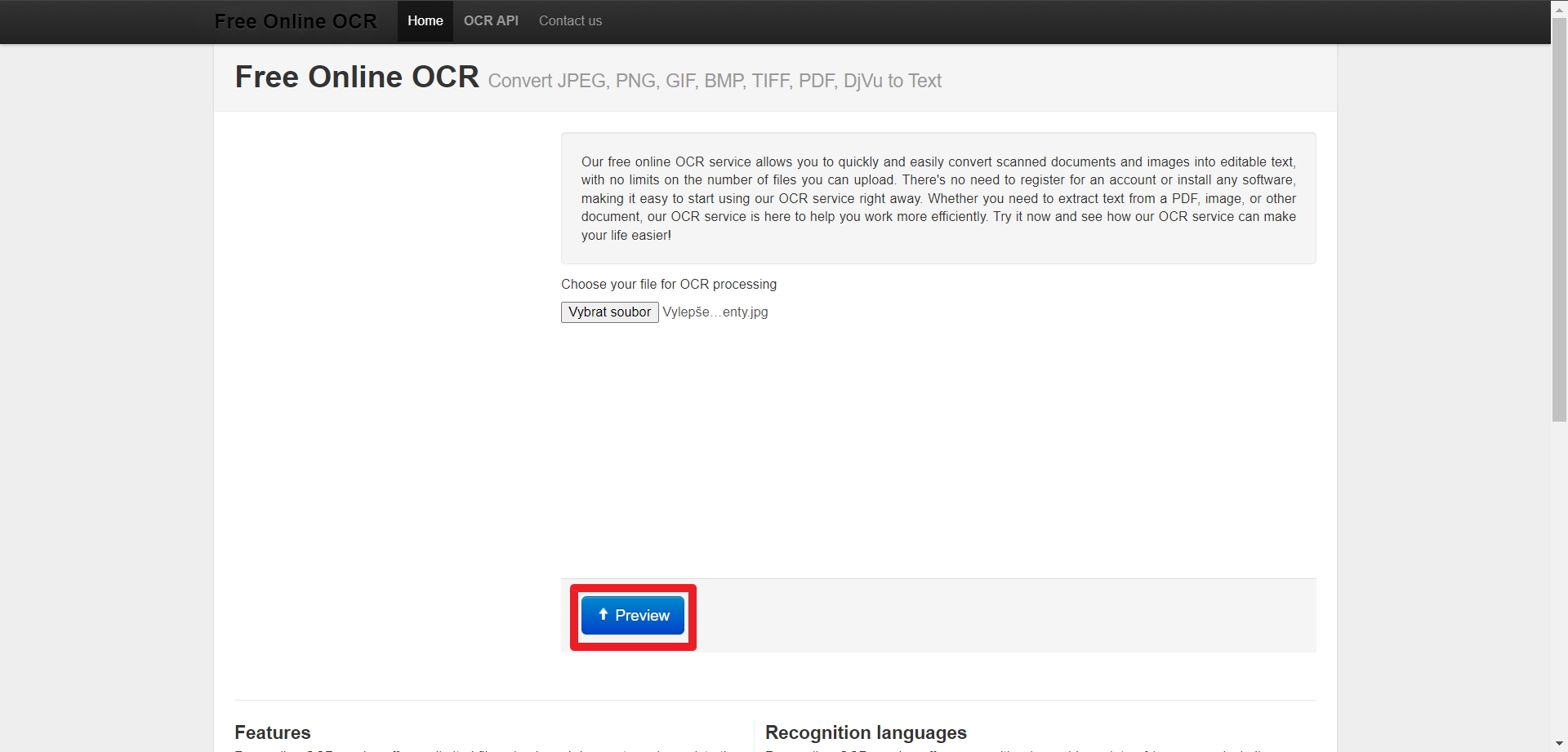 Klepněte na tlačítko Vybrat soubor Zvolte soubor s fotografií dokumentu a potvrďte tlačítkem Otevřít Klepněte na tlačítko Preview - V sekci Recognition language vyberte jazyk dokumentu (pro češtinu tedy Czech).