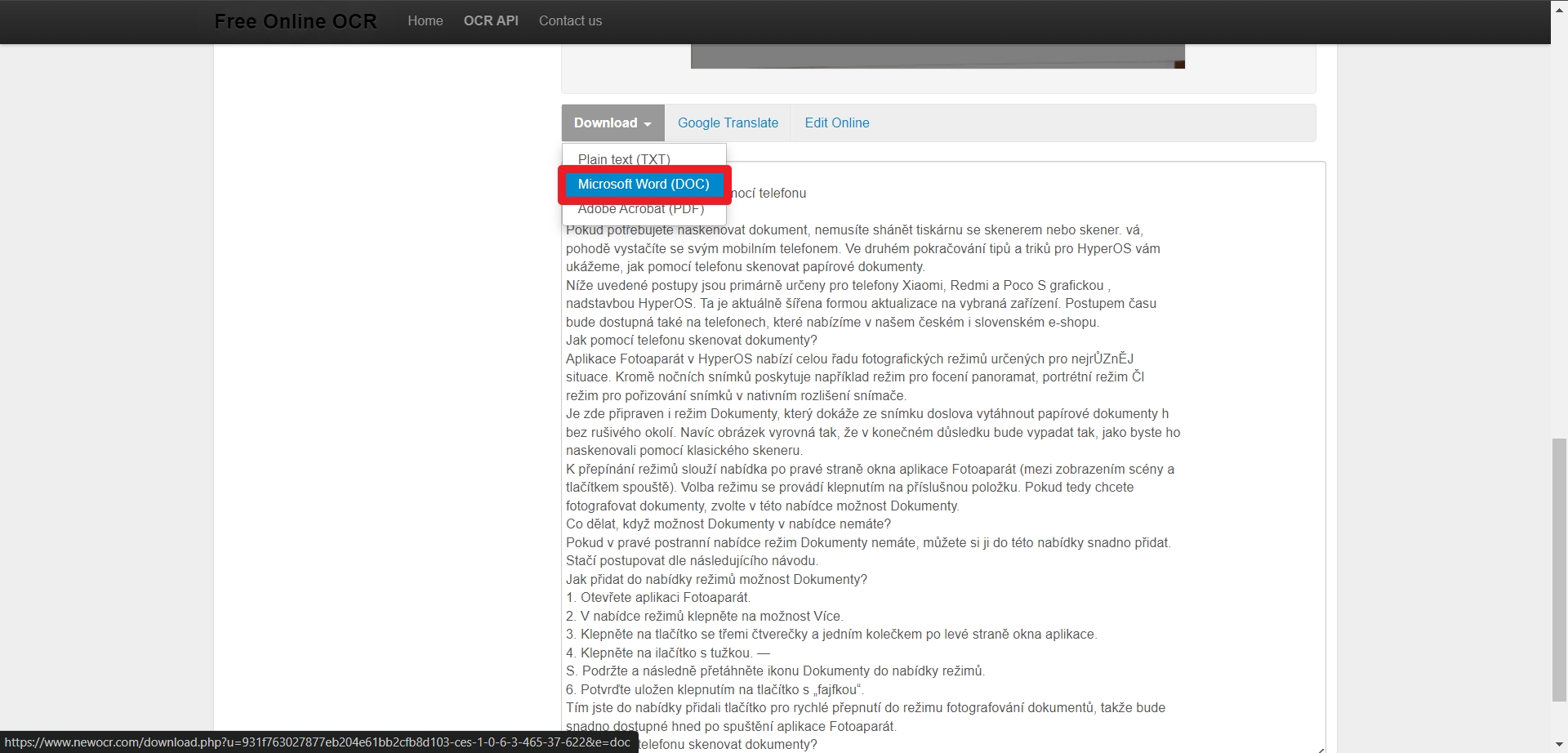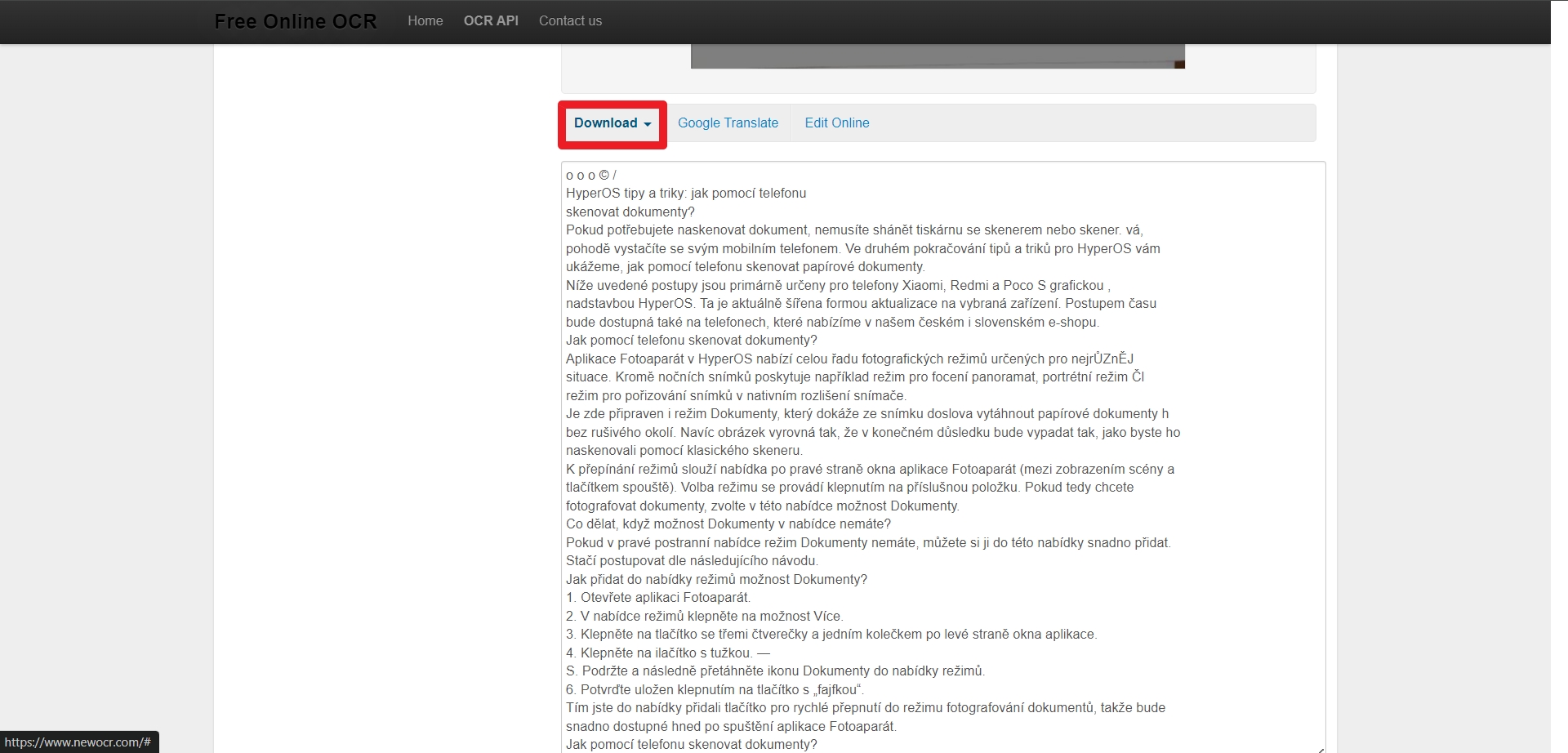 Zkontrolujte, jak aplikace poznala text Klepněte na tlačítko Download Zvolte, v jakém formátu chcete dokument stáhnout