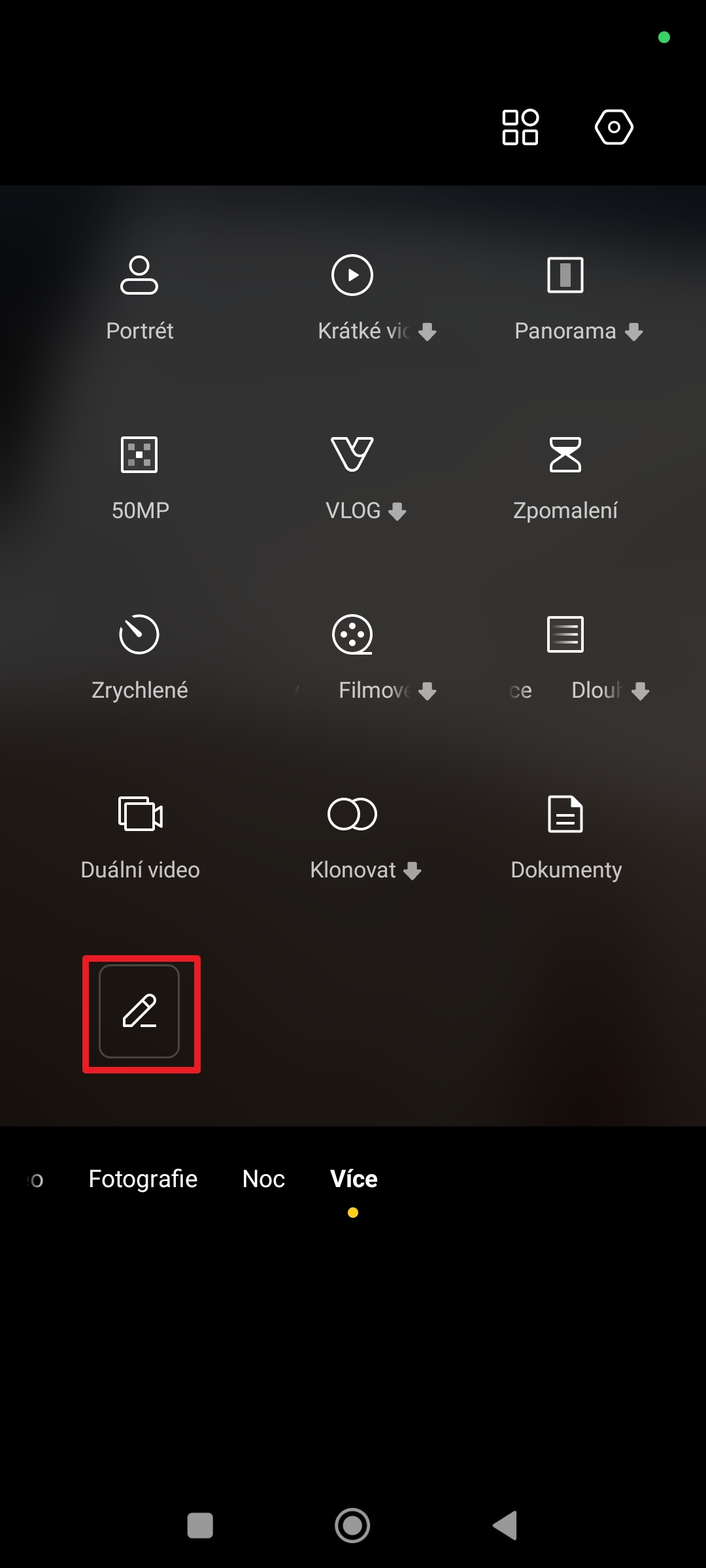 Otevřete aplikaci Fotoaparát V nabídce režimů klepněte na možnost Více Klepněte na tlačítko se třemi čtverečky a jedním kolečkem - Klepněte na tlačítko s tužkou.