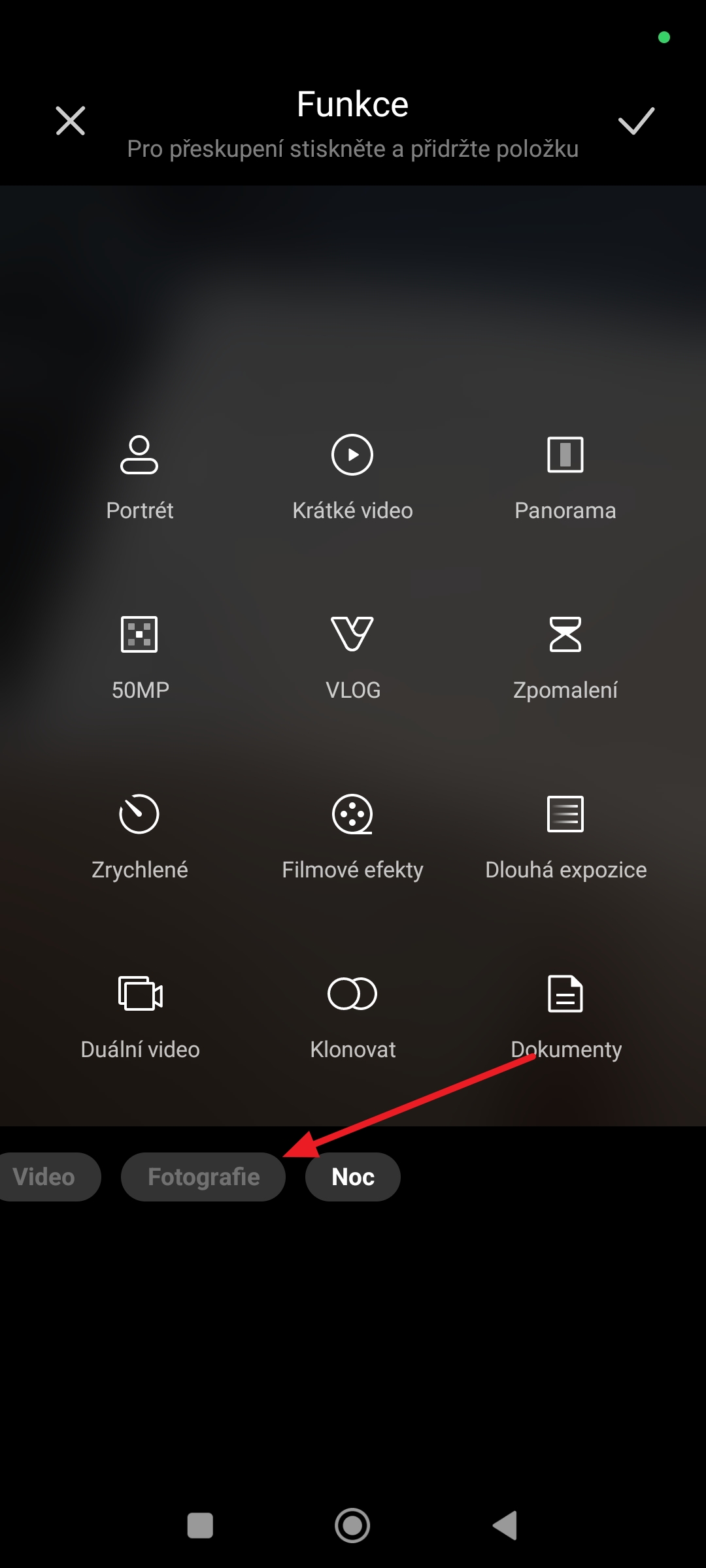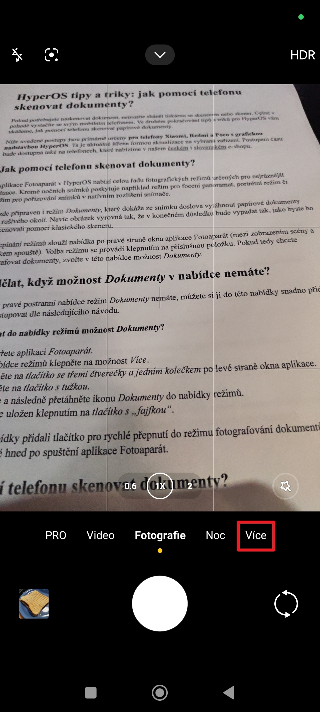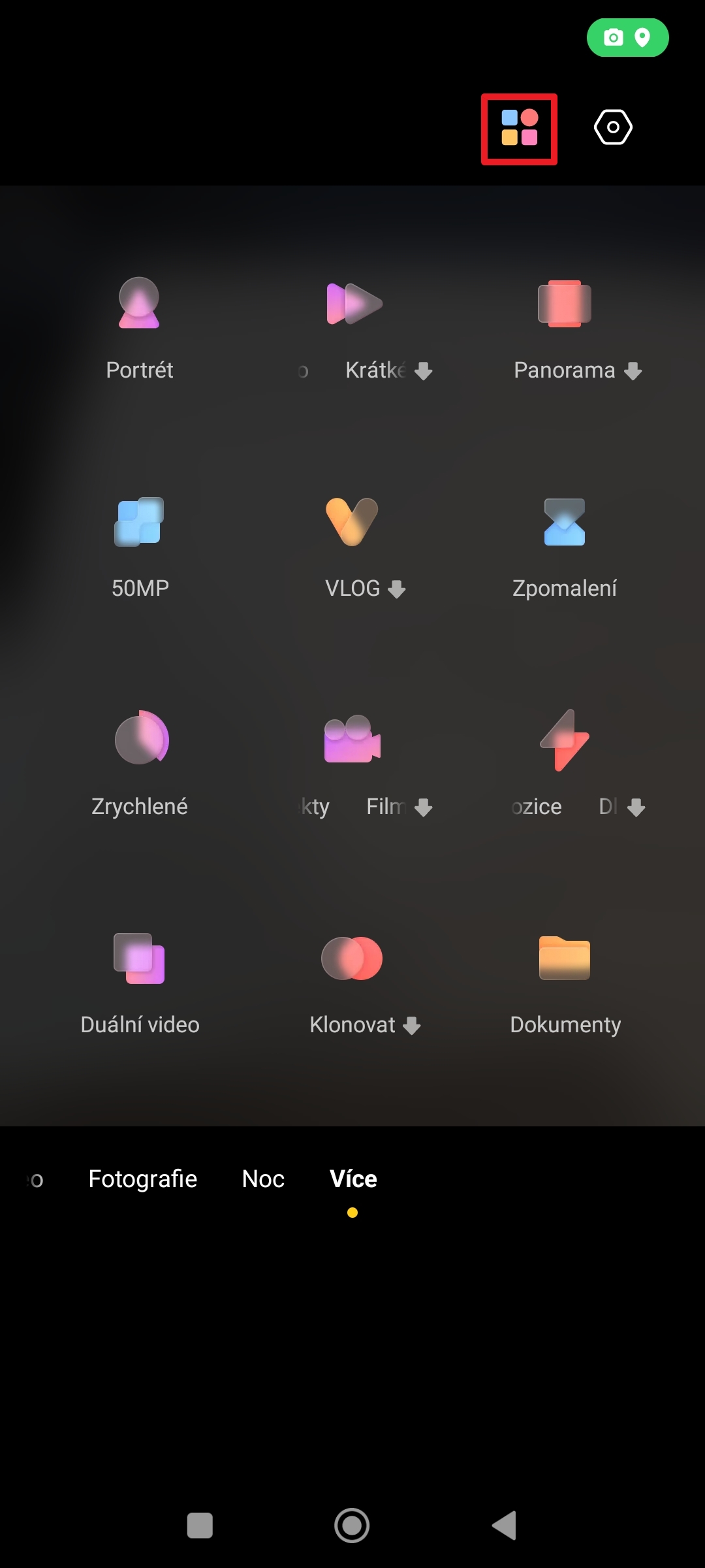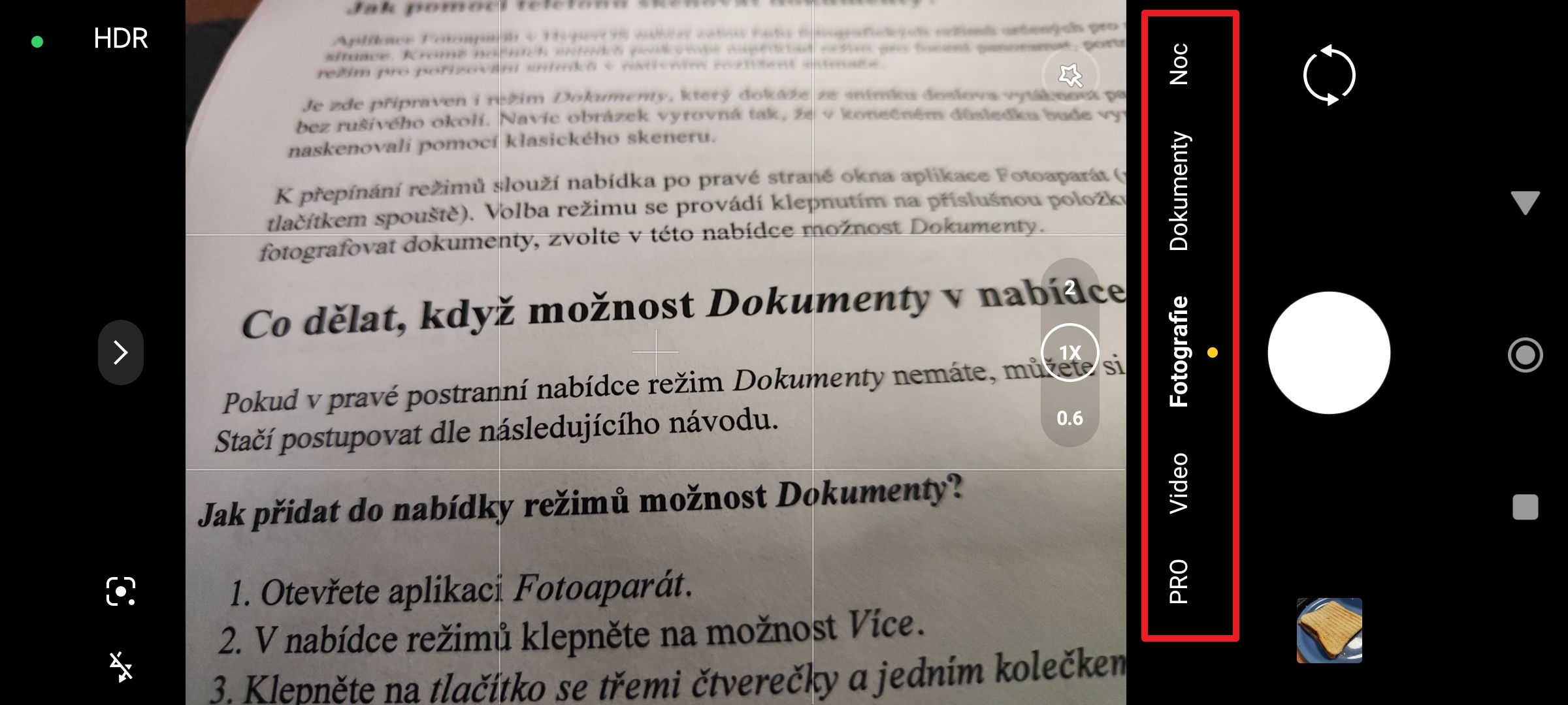 Tím jste do nabídky přidali tlačítko pro rychlé přepnutí do režimu fotografování dokumentů, takže bude snadno dostupné hned po spuštění aplikace Fotoaparát.