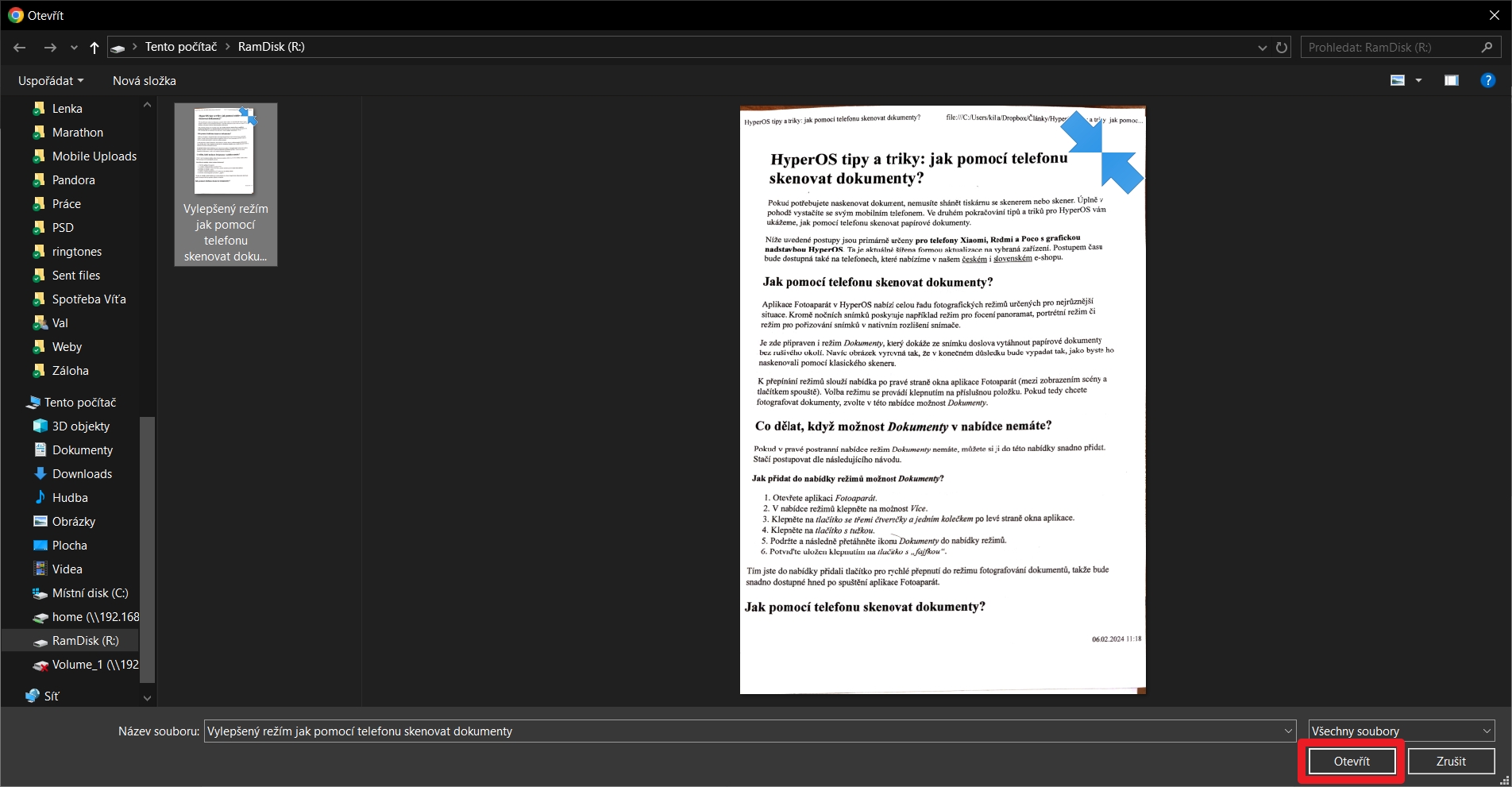 - Zvolte soubor s fotografií dokumentu a potvrďte tlačítkem Otevřít.