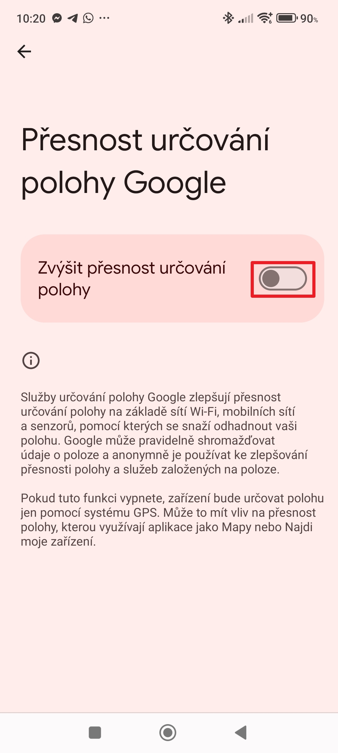 - Deaktivujte přepínač Zvýšit přesnost určování polohy.