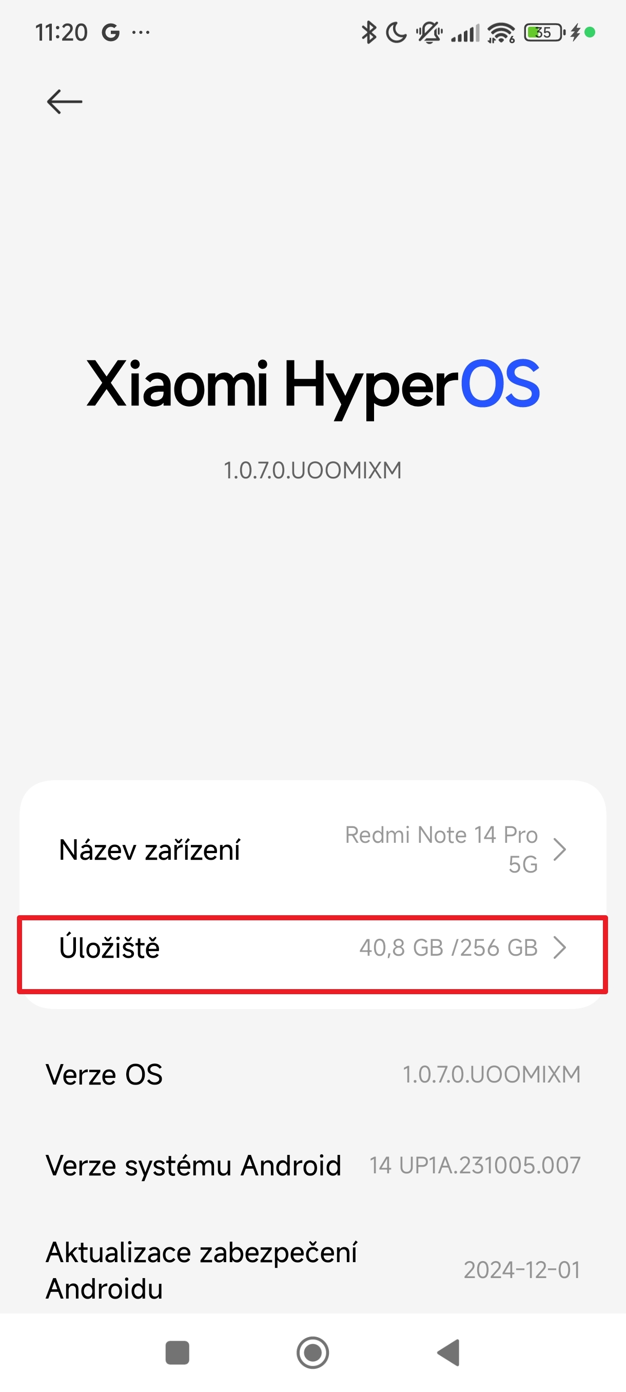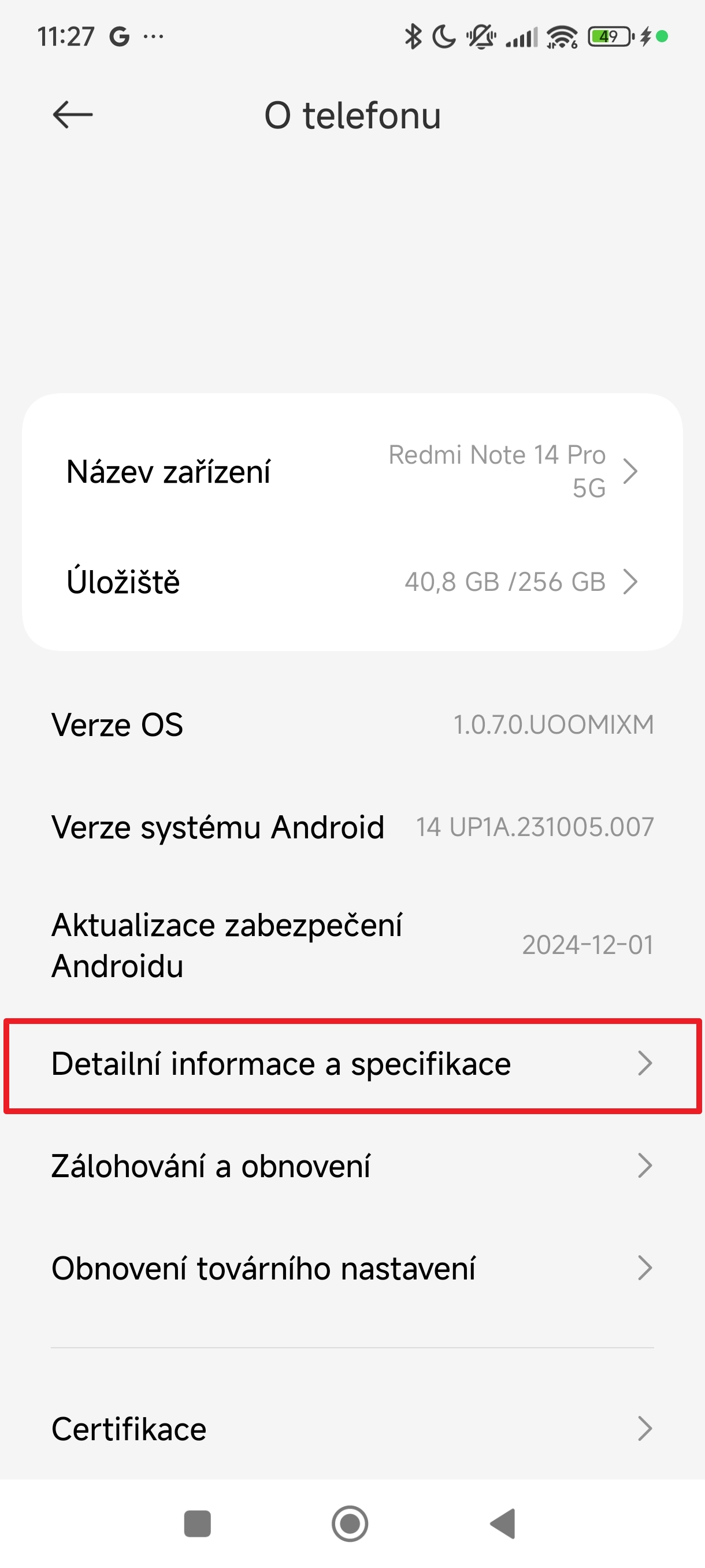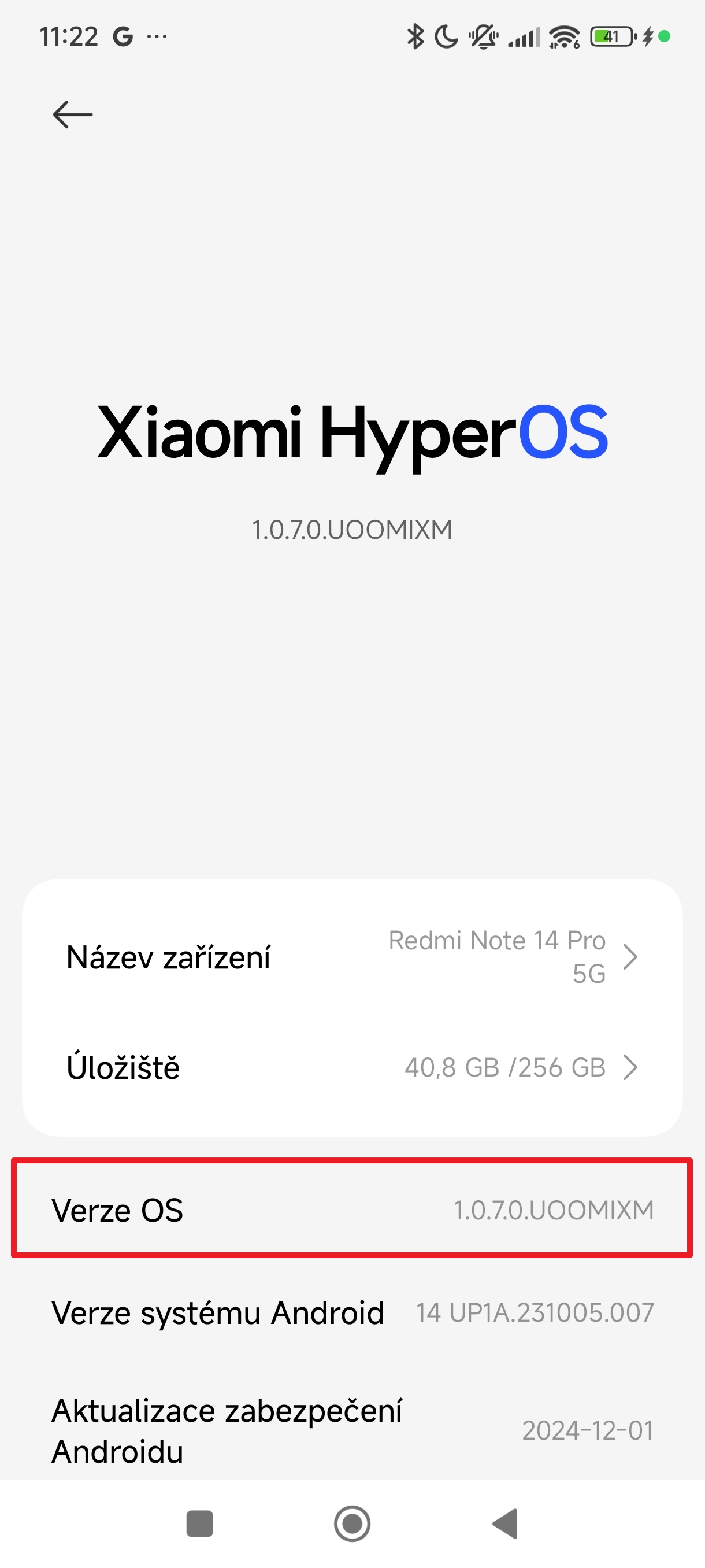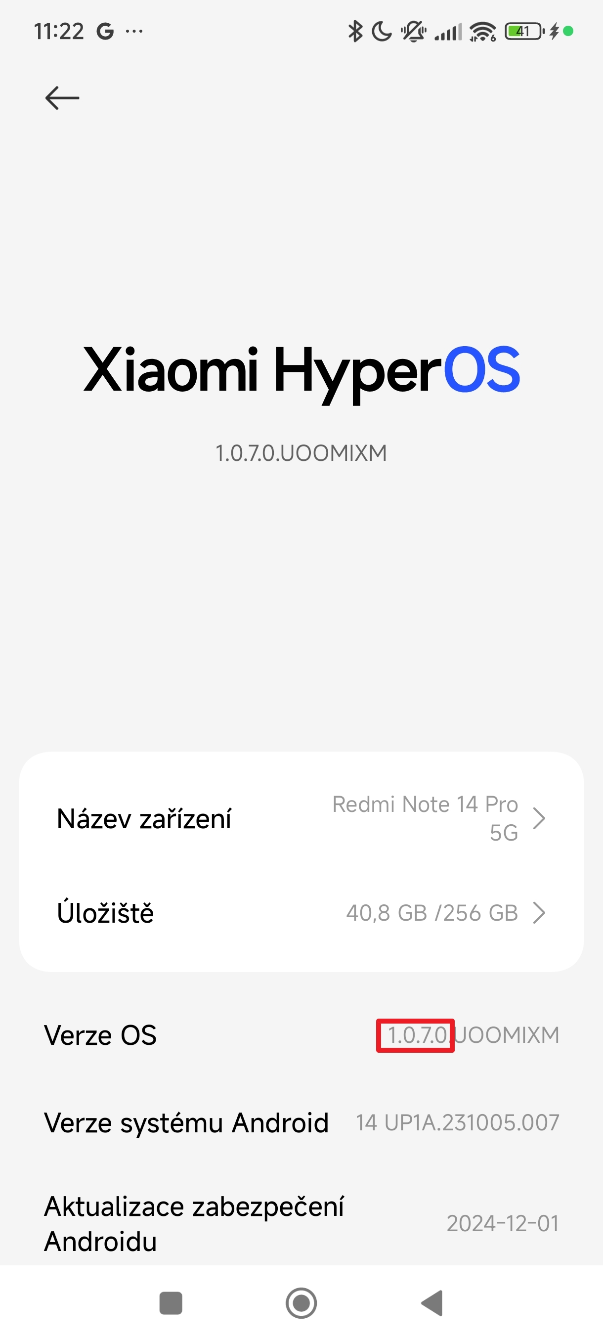 Tuto sekci nelze dále otevřít – slouží pouze k zobrazení informací. Čísla na začátku odpovídají aktuální verzi HyperOS (tj. v našem případě se jedná o verzi 1.0.7.0, tj, HyperOS 1). Ze sedmi písmen na konci pak lze vyčíst celou řadu dalších informací, jako je například verze Androidu či typ telefonu. Podrobně jsme se tomuto tématu věnovali ve článku HyperOS tipy a triky: co znamená sedm písmen ve verzi OS?
