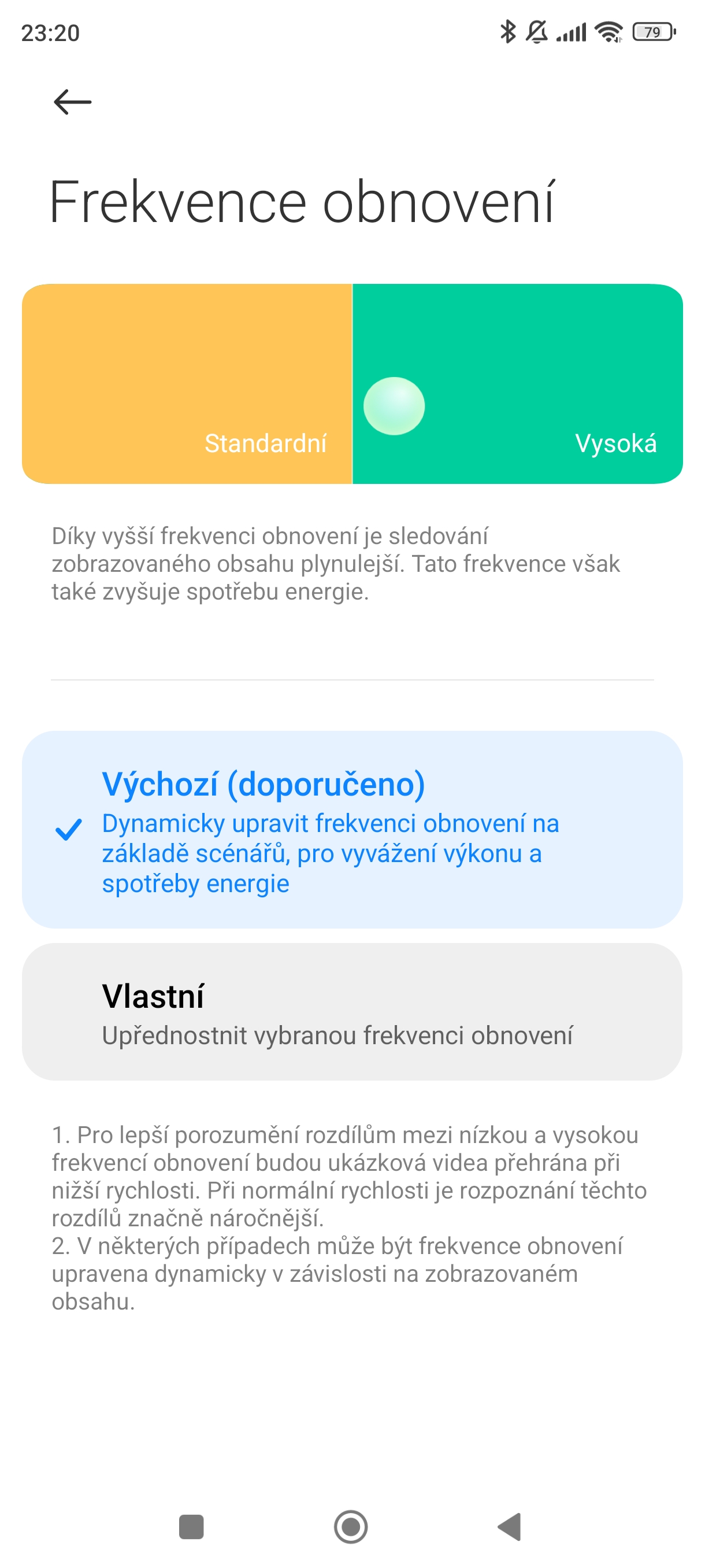 V Nastavení – Displej mohu nově nastavit Frekvenci obnovení obrazovky. Není rozdělena na klasické číselné označení, jak si jej vzpomenu například z Poco X3 NFC, ale na dvě možnosti označené jako Standartní a Vysoká. Při volbě nastavit si vlastní frekvenci mi ale nabídne buď 60 Hz nebo 120 Hz. Tato nabídka již byla v Beta 1, ale nešlo s ní pracovat.