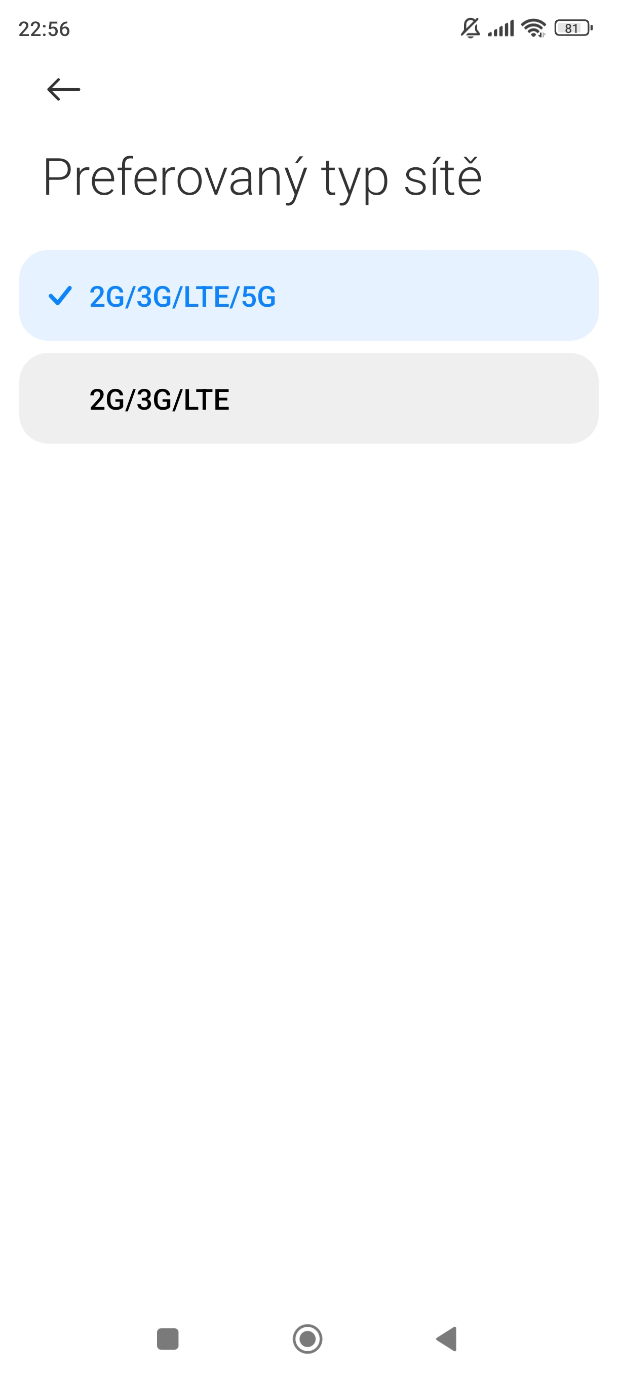 V Nastavení – SIM karty a mobilní sítě – SIM 1 – Preferovaný typ sítě došlo k menší úpravě. Opět někdo přemýšlel. Již nenabízí tři nebo čtyři položky rozdělené na sítě samostatně, ale pouze dvě, kdy je nabízeno 2G/3G/LTE či ve druhé položce to samé, obohacené o 5G. V době, kdy je LTE dostupné TÉMĚŘ všude, by byla hloupost nemít ho nastaveno, pokud uživatel bydlí mimo 5G sítě. Na druhou stranu, stále mi zde chybí možnost preference nastavení, zda má vybírat primárně silnější siť, nebo stabilnější síť. Tedy, že i když se na telefonu lze připojit přes LTE na jednu čárku, může být 3G silnější a tedy stabilnější, což může dost ovlivnit hovory, zprávy a jiné připojení pomocí mobilních dat či mobilní buňky. Ale jde o mou úvahu, pro běžného uživatele nepotřebné.