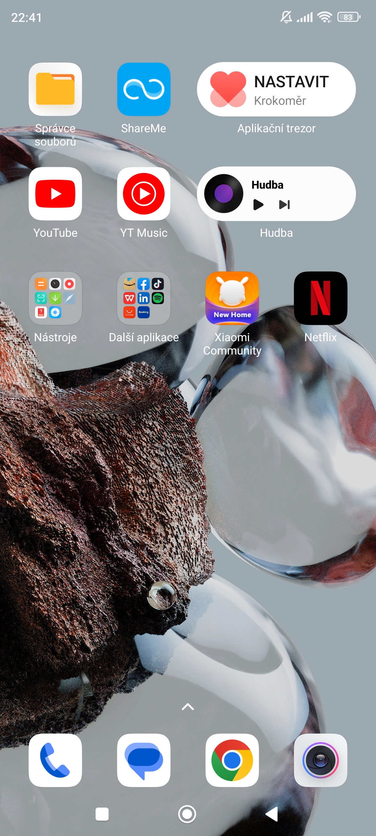 Na Domovské obrazovce už ale změna je. Od jisté aktualizace MIUI 14 tam přibyly dvě větší ikony, kdy jedna je Krokoměr a druhá MiVideo. MiVideo je v této verzi už jen a pouze Hudba. Někdo tam nahoře konečně přemýšlel. Jinak také vše stejné.