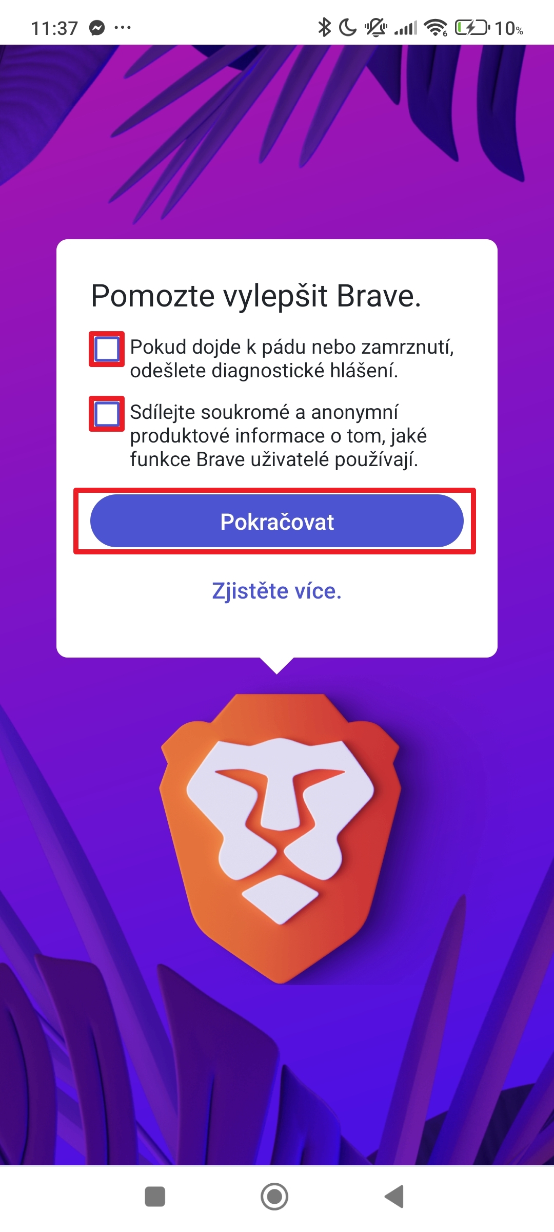 Stáhněte a nainstalujte si prohlížeč Brave Spusťte prohlížeč Brave Není nutné, aby byl Brave výchozí Odpovězte Možná později - V dialogu Pomozte vylepšit Brave deaktivujte obě volby a klepněte na Pokračovat.