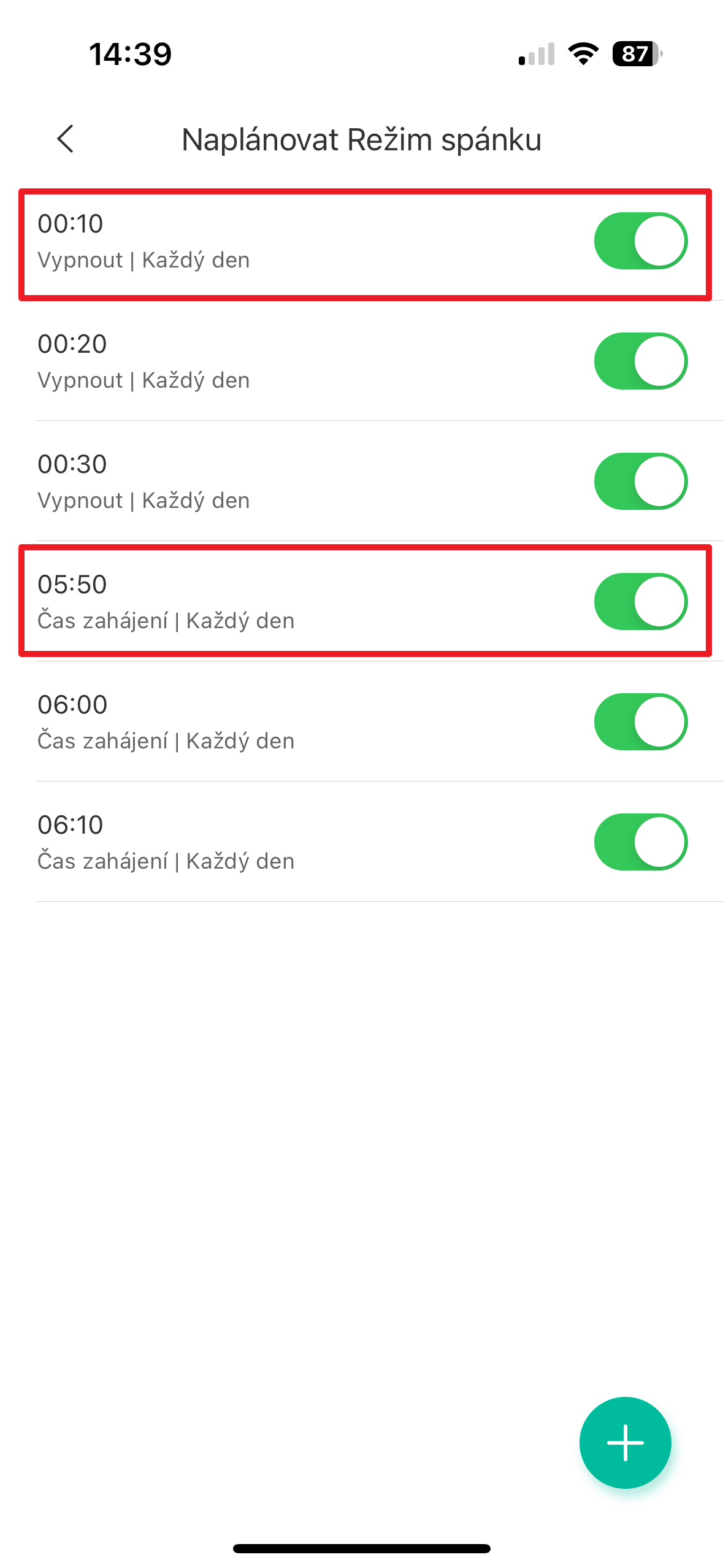 Jednou z funkcí této zásuvky je možnost automaticky vypínat a zapínat připojený spotřebič v určitých dnech a časech. Protože v noci nikdo teplou vodu nepoužívá, nastavili jsme, aby se zásuvka každý den vypnula deset minut po půlnoci a zapnula se v čase 5:50.