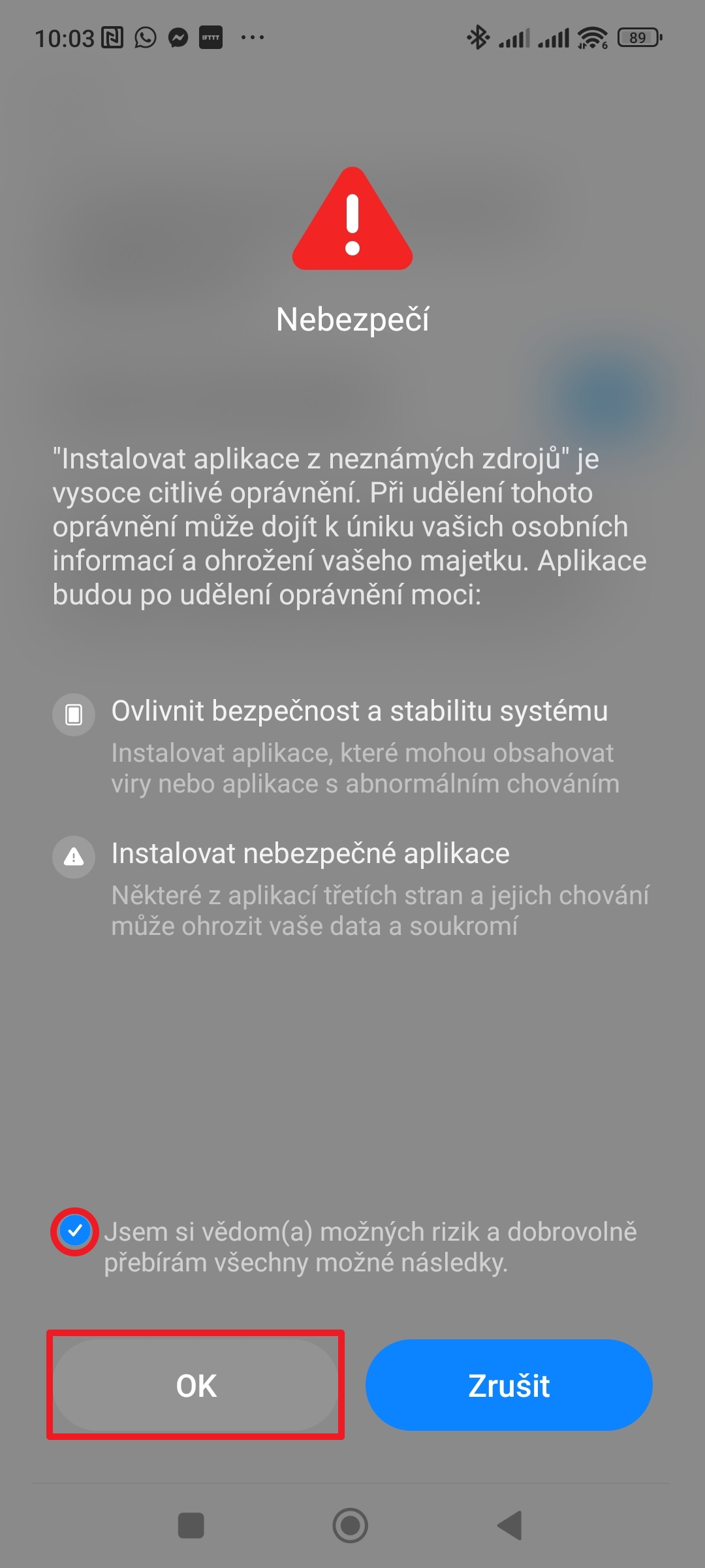 5. Pokud se zobrazí varování, že nemáte povolené instalovat neznámé aplikace, klepněte na tlačítko Nastavení.