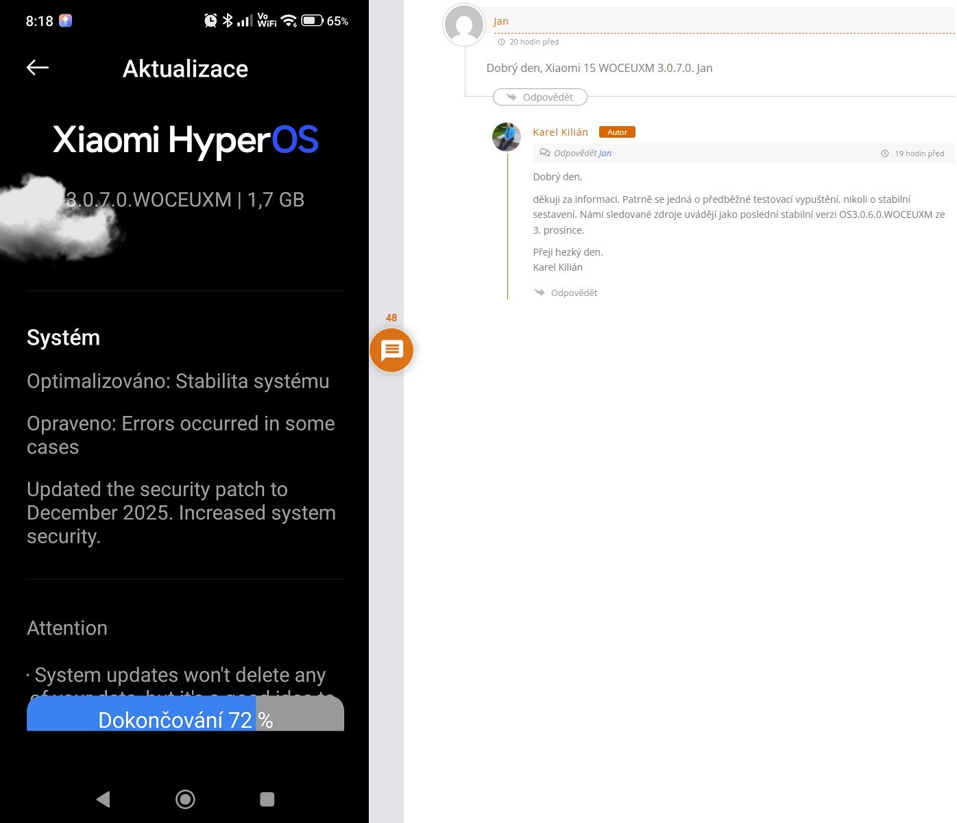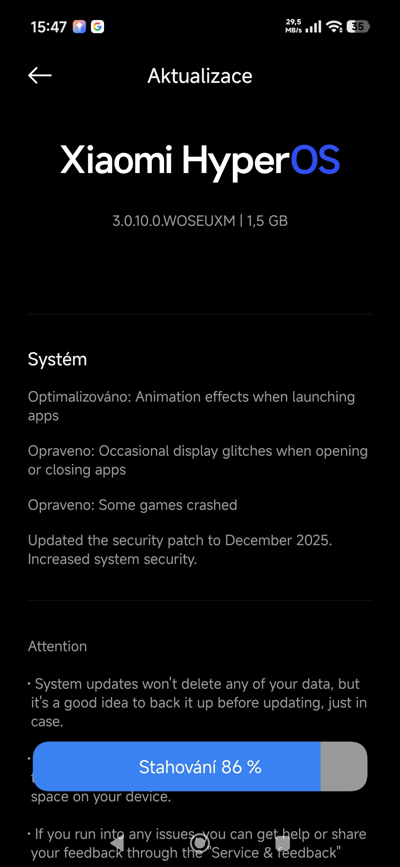 Tu distribuci chápu, ale je divné, že jsem nedostal předposlední aktualizaci dříve než vyšla další. Napadlo mě, že je to způsobeno velkým množstvím oprav HyperOS, takže vydávají update rychleji, než je uvolňují ke stažení.