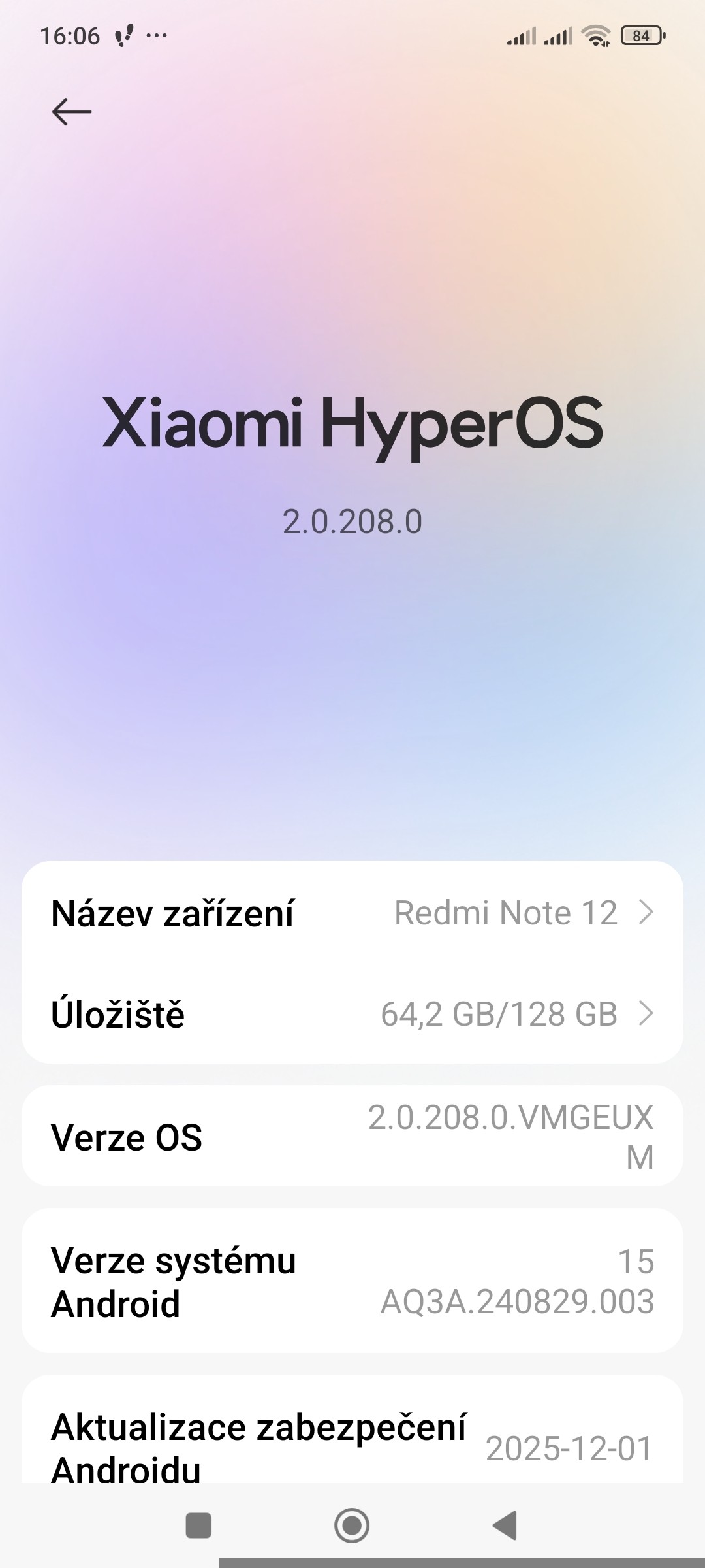 • Redmi Note 12S (evropská verze) dostává od 3. ledna 2026 aktualizaci na OS2.0.208.VHZEUXM. Jedná se o nadstavbu HyperOS ve verzi 2.0 postavenou na Androidu 15.