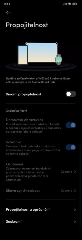 Novinkou v této nové verzi HyperOS je přidaná funkce „Propojitelnost“. V Nastavení telefonu se nyní „Propojitelnost“ nalézá mezi funkcí „Mobilní sítě“ a „Další možnosti připojení“ Onu funkci Propojitelnost jsem totiž nedávno objevil ve svém tabletu Xiaomi Pad 6 po jeho aktualizaci. Takže Propojitelnost dokáže najít v okolí zařízení (mobil, tablet, chytré hodinky) přihlášená k vašemu Xiaomi účtu, které pak můžete přidat do Xiaomi Smart Hub.