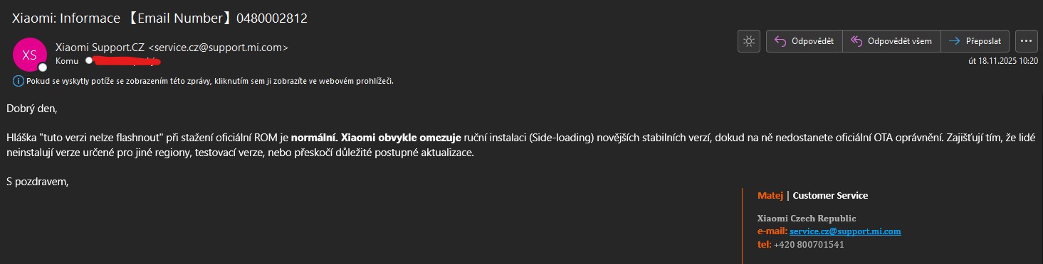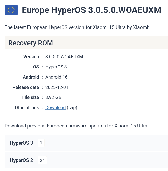 Nějaké důležité info, které jsem pohledal z diskuzí a z podpory od Xiaomi. Nelze již instalovat stažené recovery ROM, je to od verzí s HyperOS blokované, tedy nelze nainstalovat novější ROM, pokud nebyla dříve nainstalovaná jako OTA aktualizace. Proto to prý hlásí tu hlášku ohledně toho že nejde tato verze flashnout a že nejde tuto ROM ověřit. Sice to trochu postrádá smysl, ale budiž. Na internetu existuje v diskuzích hromada lidí, kteří mají taktéž „blok“ a vyšší verzi než 2.0.204.0.VOAEUXM nedostali do teď. Takže v drtivé většině případů se další aktualizace majitelům 15 Ultra nedostali. Klíčová bude asi doba do konce listopadu, snad to do té doby nasadí už ve větším. Sám jsem se raději přihlásil do beta programu, abych více zapadl do MiPilot, ale ani to mi zatím nepřineslo možnost aktualizace, takže čekám, čekám.