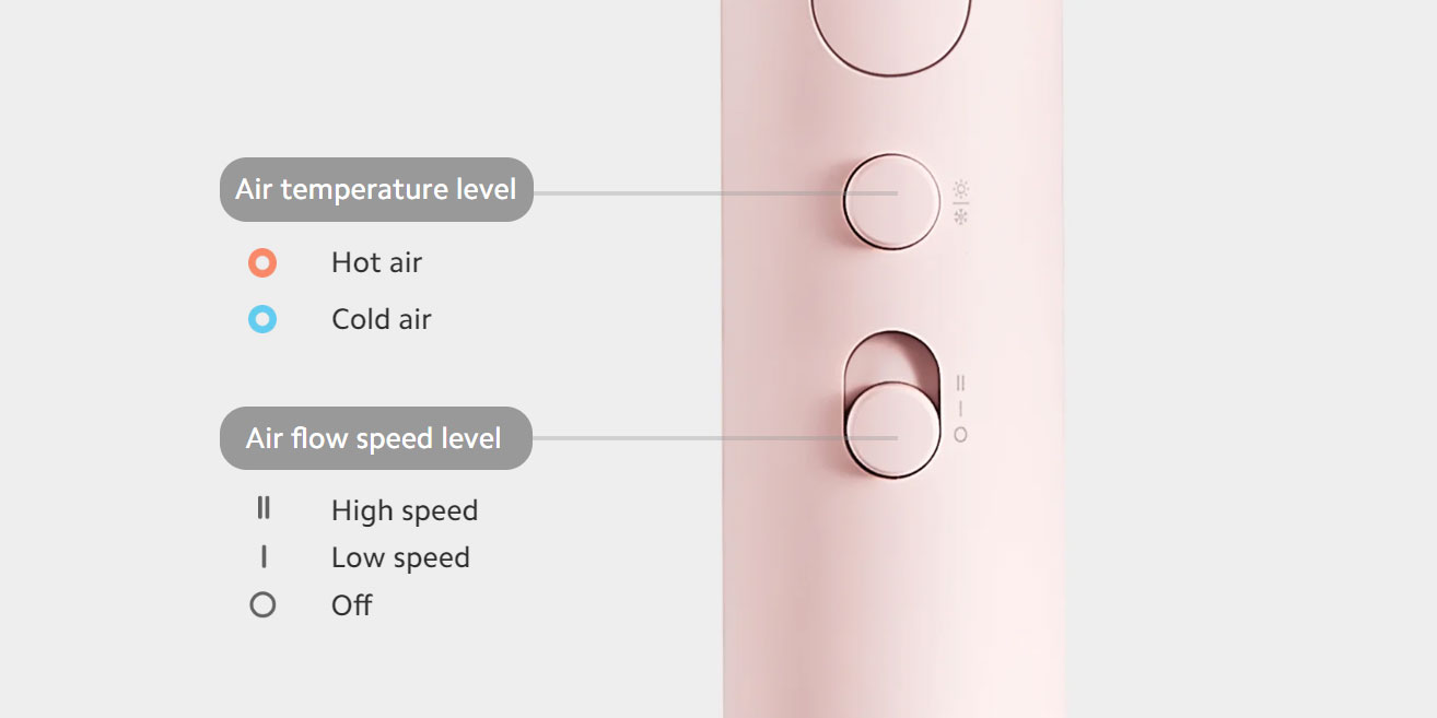 Uživatel může volit mezi dvěma teplotami vzduchu – teplou, nebo studenou. Ty lze dále kombinovat se dvěma rychlostmi průtoku vzduchu – nízkou, nebo vysokou. Režimy lze jednoduše přepínat stiskem tlačítka tak, aby vyhovovaly různým potřebám při sušení vlasů.