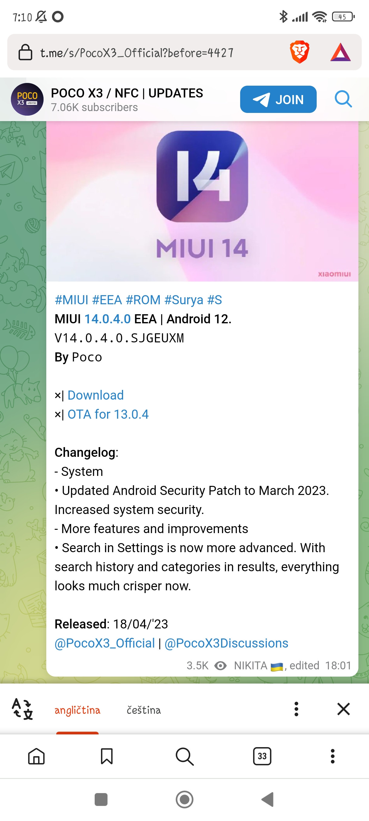 Dobrý den! Tak mi právě dnes tj.19.04.2023 došla aktualizace na telefon Redmi Note 11 NFC 13.0.6.0.(SGKEUXM) se zaplatou k 1.4.2023 evropská verze. A to mám telefon od operátora! S pozdravem Martin