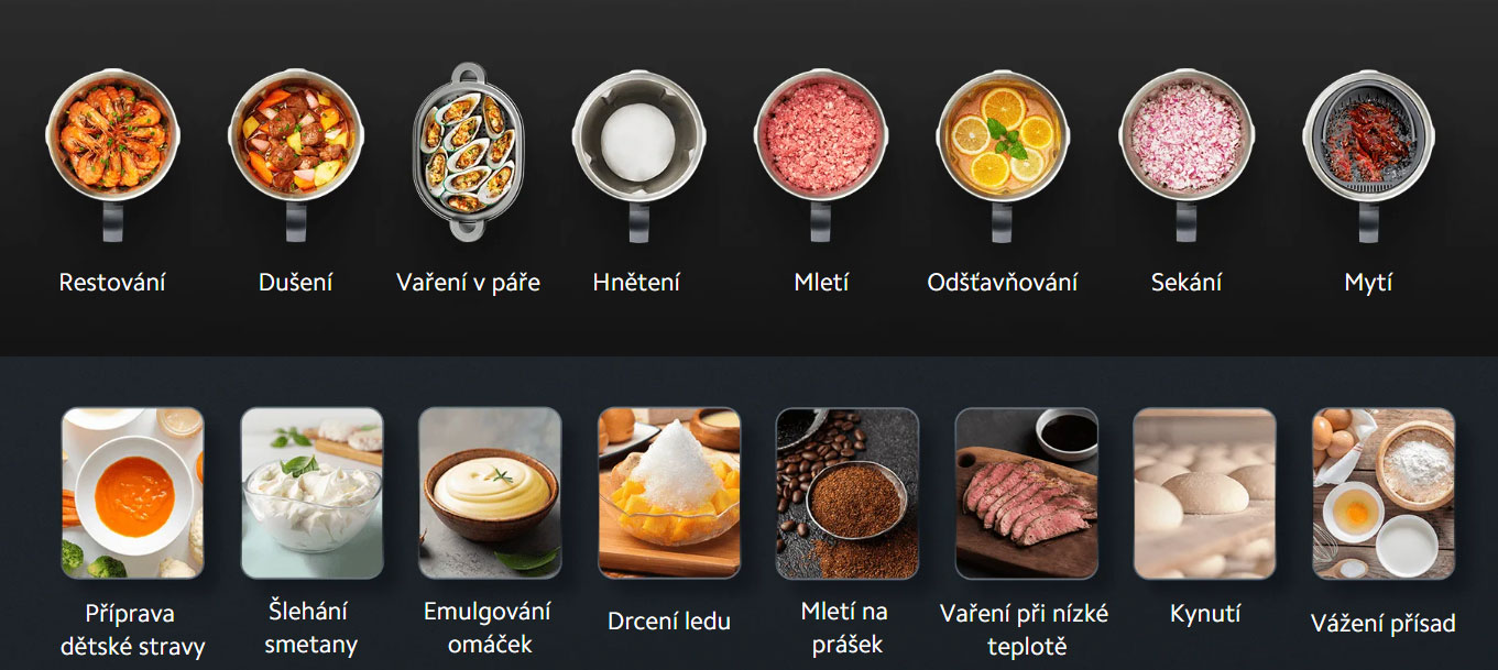 Celkem nabízí 35 funkcí, pro které byste jinak potřebovali sadu kuchyňských spotřebičů. Může tak velice výrazně ušetřit místo v kuchyni. Zastane roli: