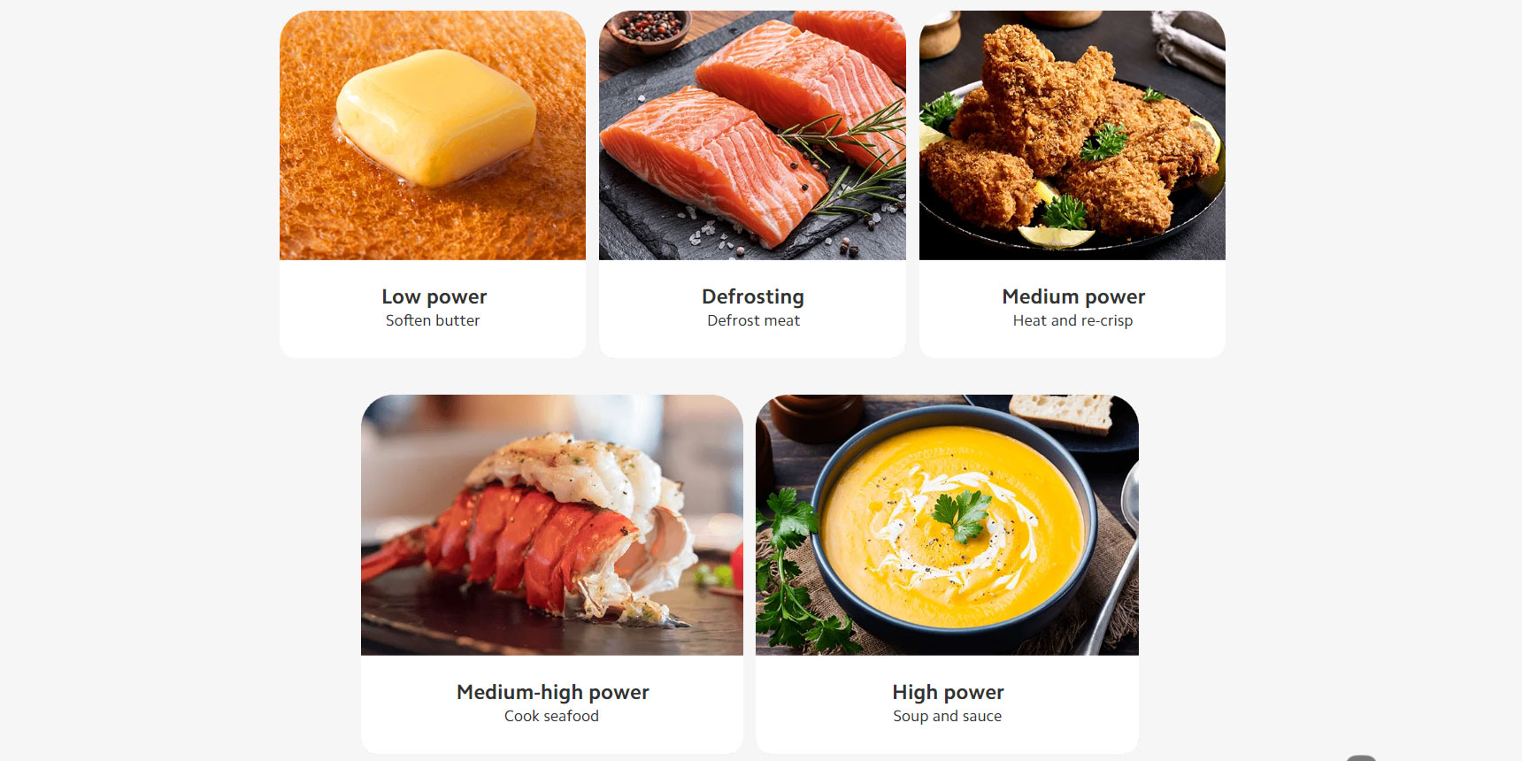 Výkon mikrovlnné trouby lze nastavovat v pěti stupních, což uživateli dává možnost přizpůsobit ohřev podle svých preferencí a typu potravin. K dispozici je například nízký výkon pro změkčení másla, rozmrazování masa, střední výkon pro ohřev jídel, vyšší výkon pro vaření mořských plodů a vysoký výkon pro přípravu polévek a omáček.