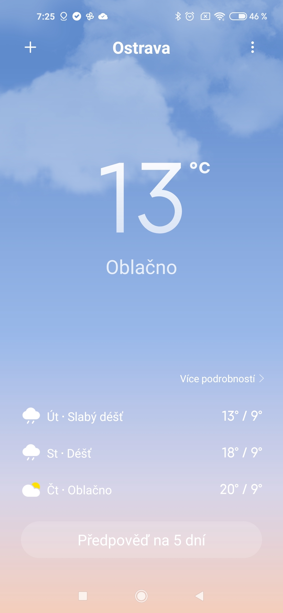 Po vyhledání se zobrazí náhled předpovědi na následujících pět dnů. Tlačítkem plus můžete toto město přidat mezi sledované. Tímto způsobem se bude zobrazovat na hlavní obrazovce po spuštění aplikace. Aktuální verze ukazuje na pozadí živou tapetu, jež by měla odpovídat reálné situaci na obloze.