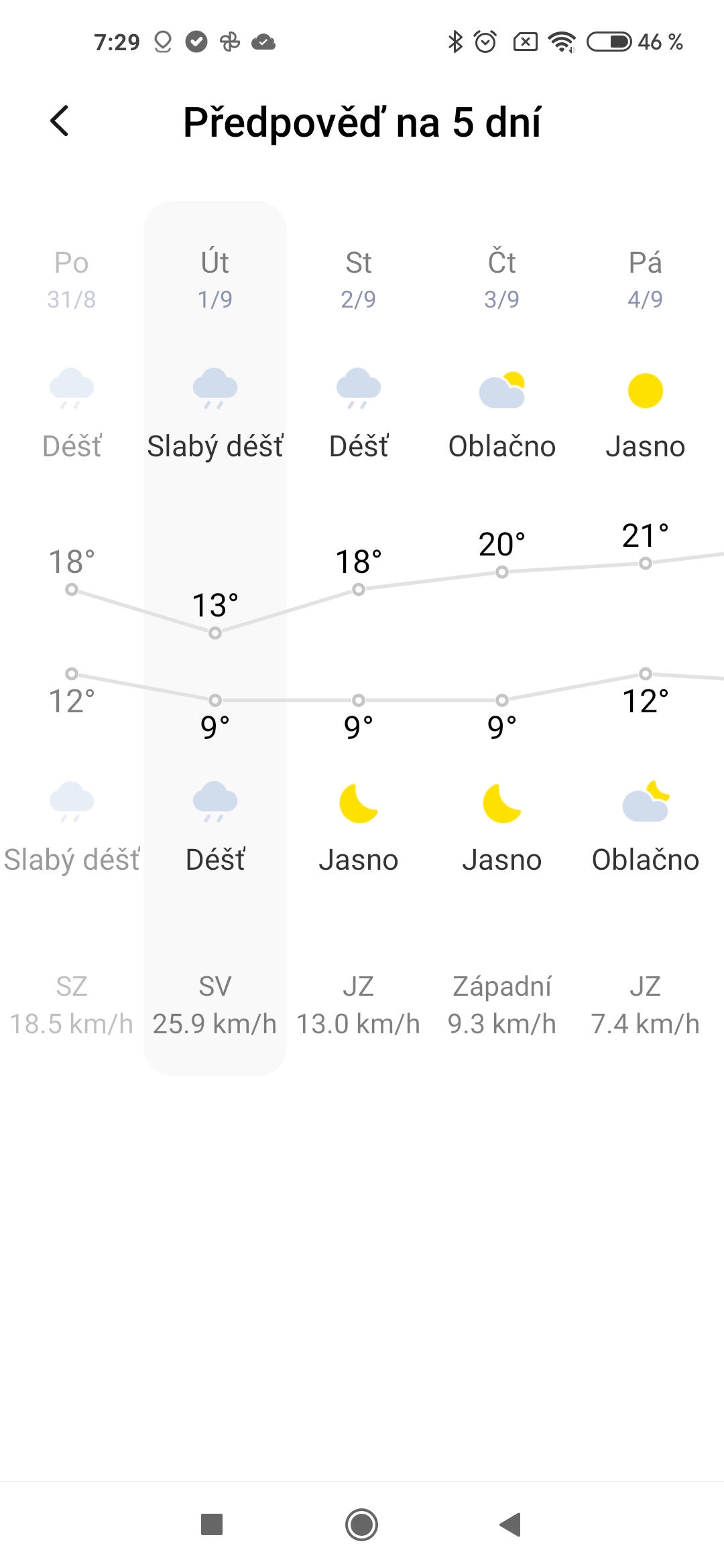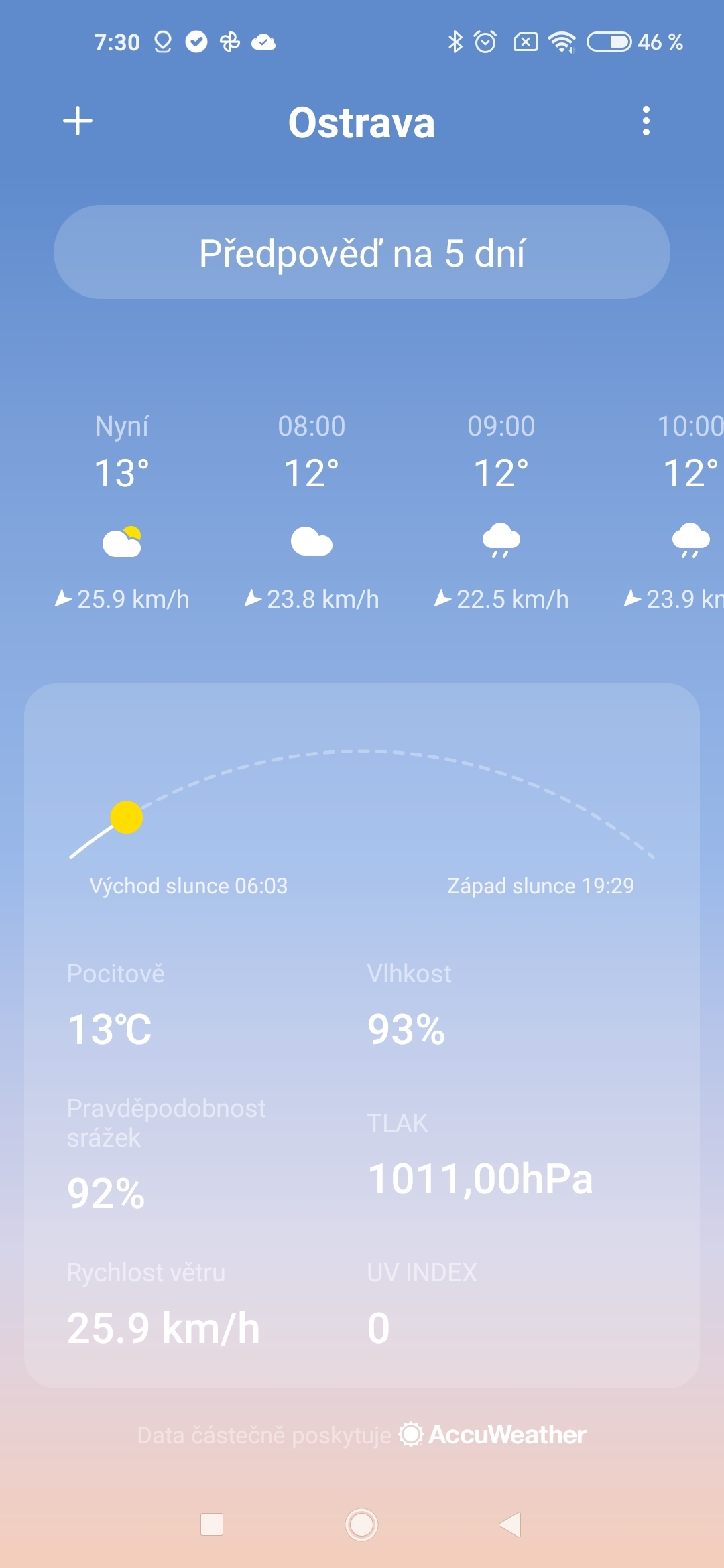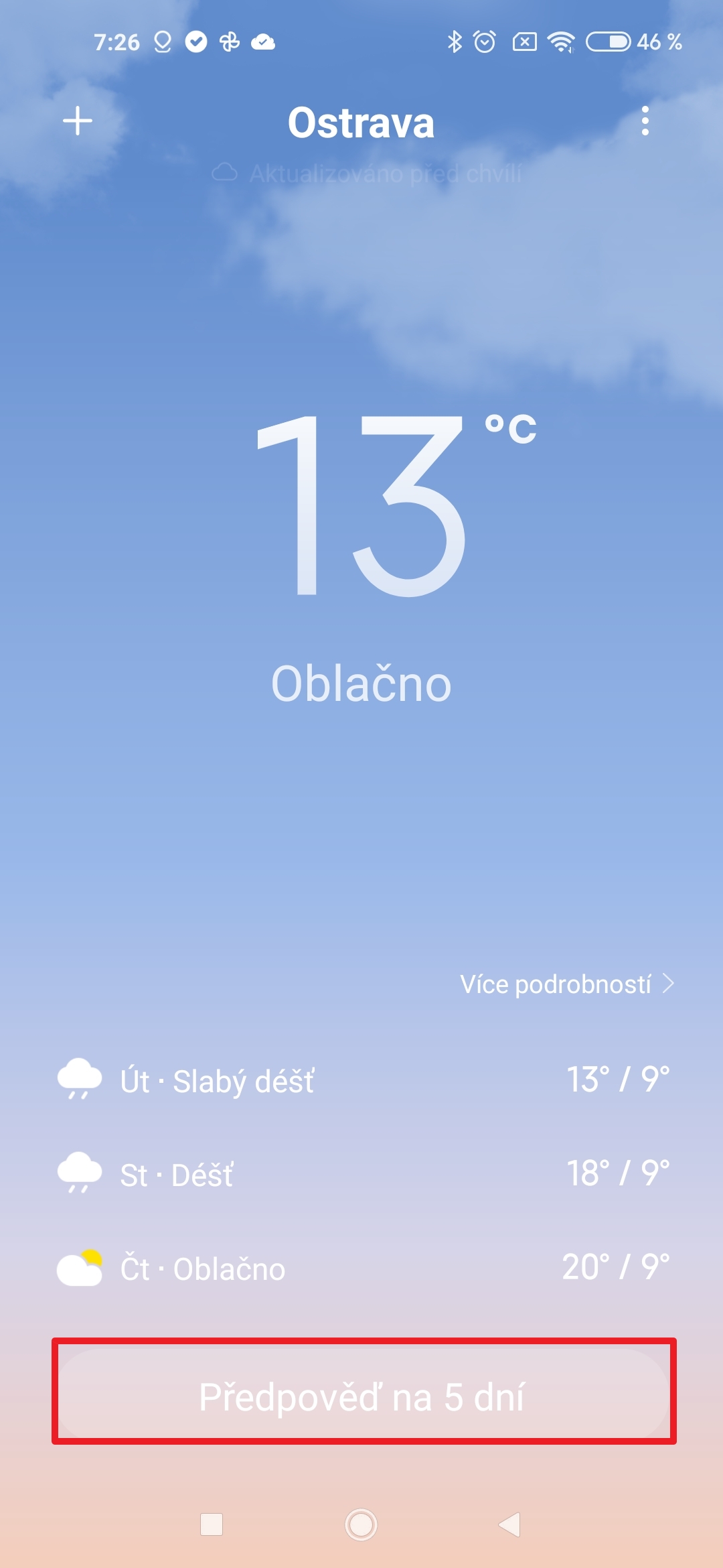 Níže najdete předpověď nejvyšších a nejnižších očekávaných teplot pro aktuální a dva následující dny. Chcete-li zobrazit prognózu na následujících pět dní, klepněte na tlačítko Předpověď na 5 dní. Zde najdete informace o nejvyšších a nejnižších předpokládaných teplotách a stručný popis situace ve dne a v noci. Dodejme, že aplikace Počasí čerpá data ze služby AccuWeather.