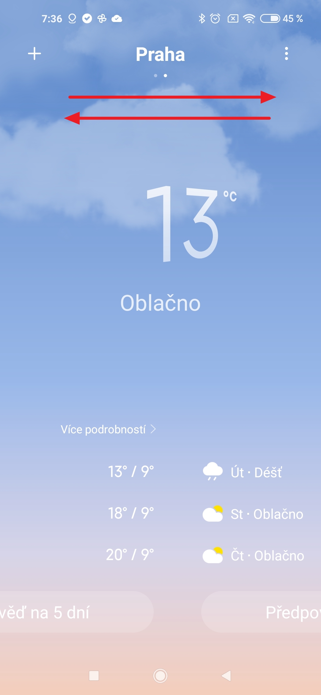 Na hlavní obrazovce pak můžete snadno přepínat mezi všemi sledovanými místy posouváním obrazovky doleva, respektive doprava. Počet míst, jež můžete tímto způsobem sledovat, není nijak omezen.