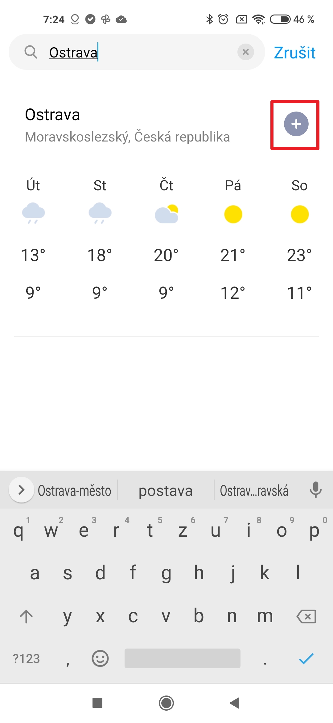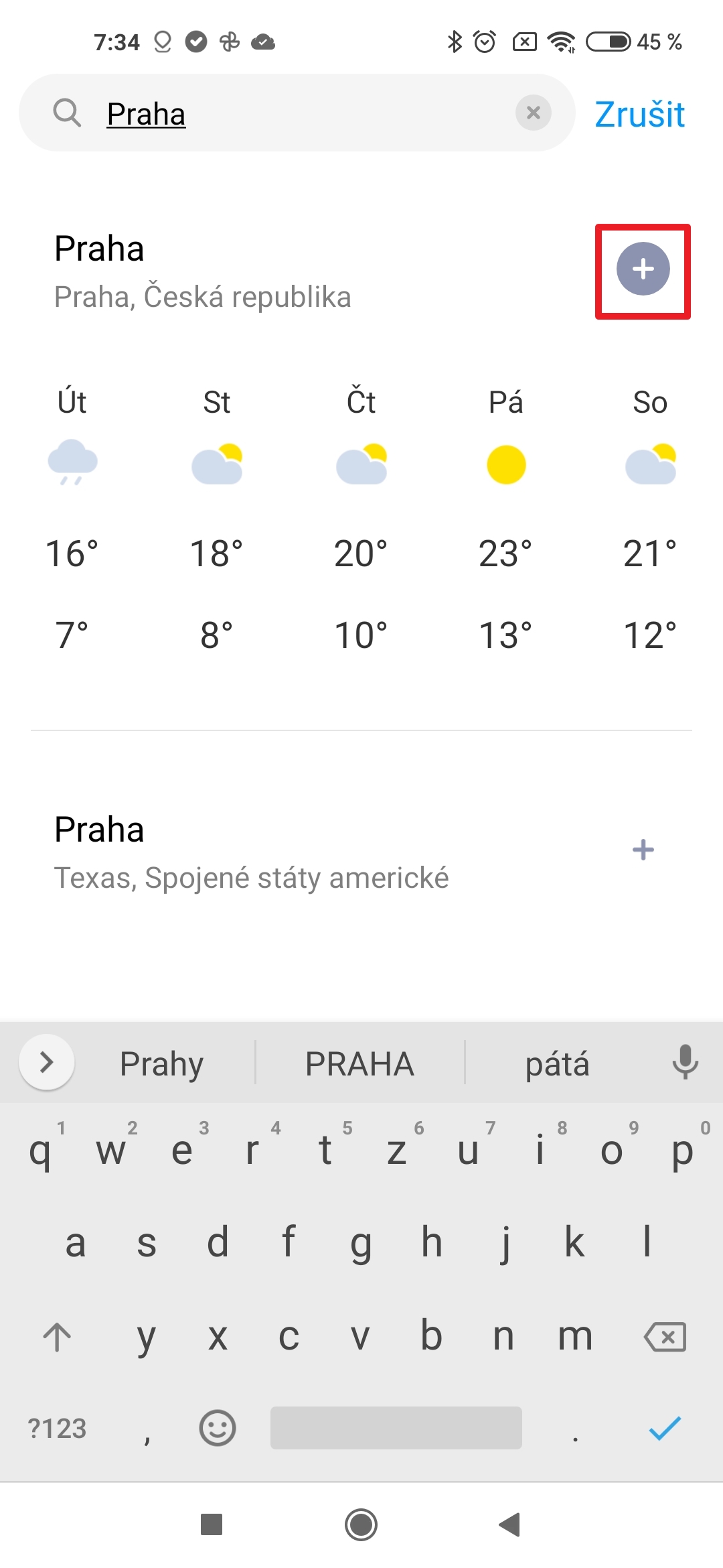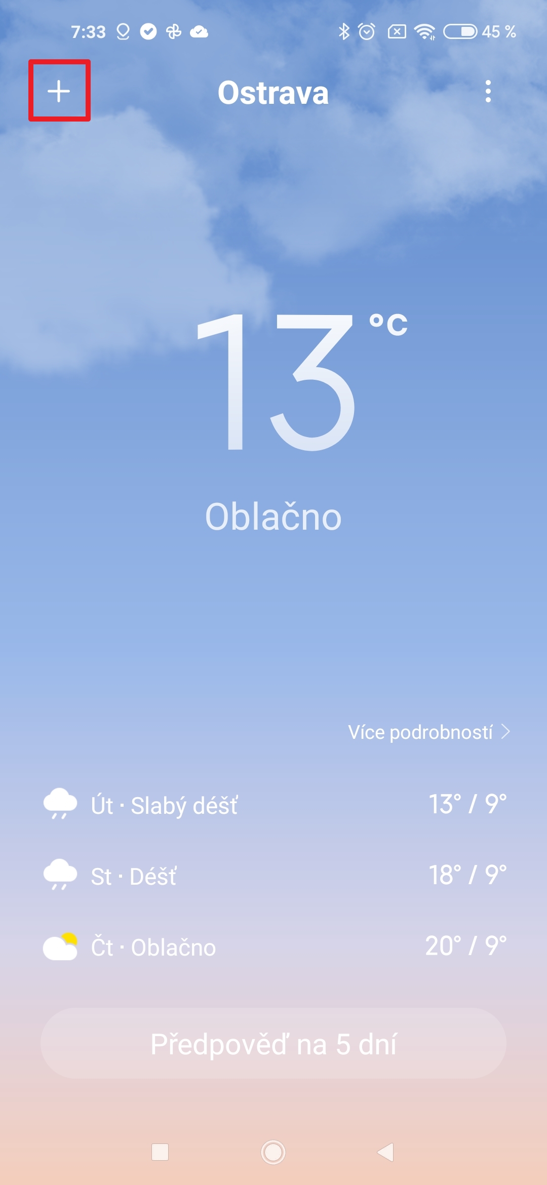 Pokud chcete sledovat počasí na více místech najednou – například v místě svého bydliště a v destinaci, kam se chystáte na dovolenou – můžete využít možnost přidání další lokality. K tomu slouží tlačítko plus v levém horním rohu aplikace.