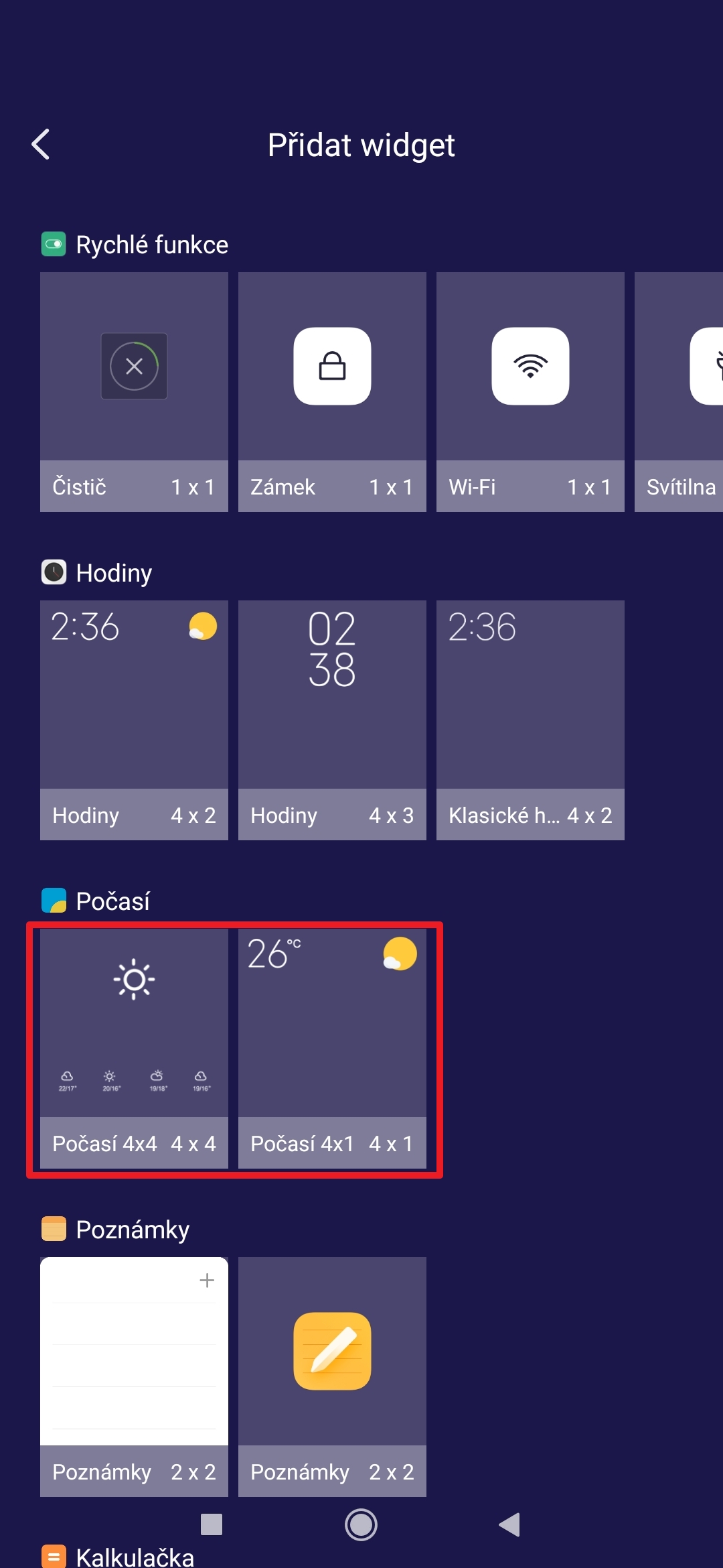 - Vyberte widget Počasí 4×4, nebo Počasí 4×1.