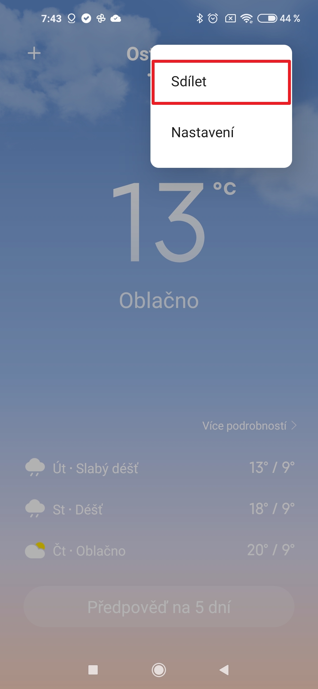 Pokud se chcete podělit s rodinou či přáteli o aktuální počasí a předpověď na další dny, můžete samozřejmě udělat snímek obrazovky a ten následně odeslat. Jde to ale i maličko jednodušeji a výsledek je prakticky stejný.