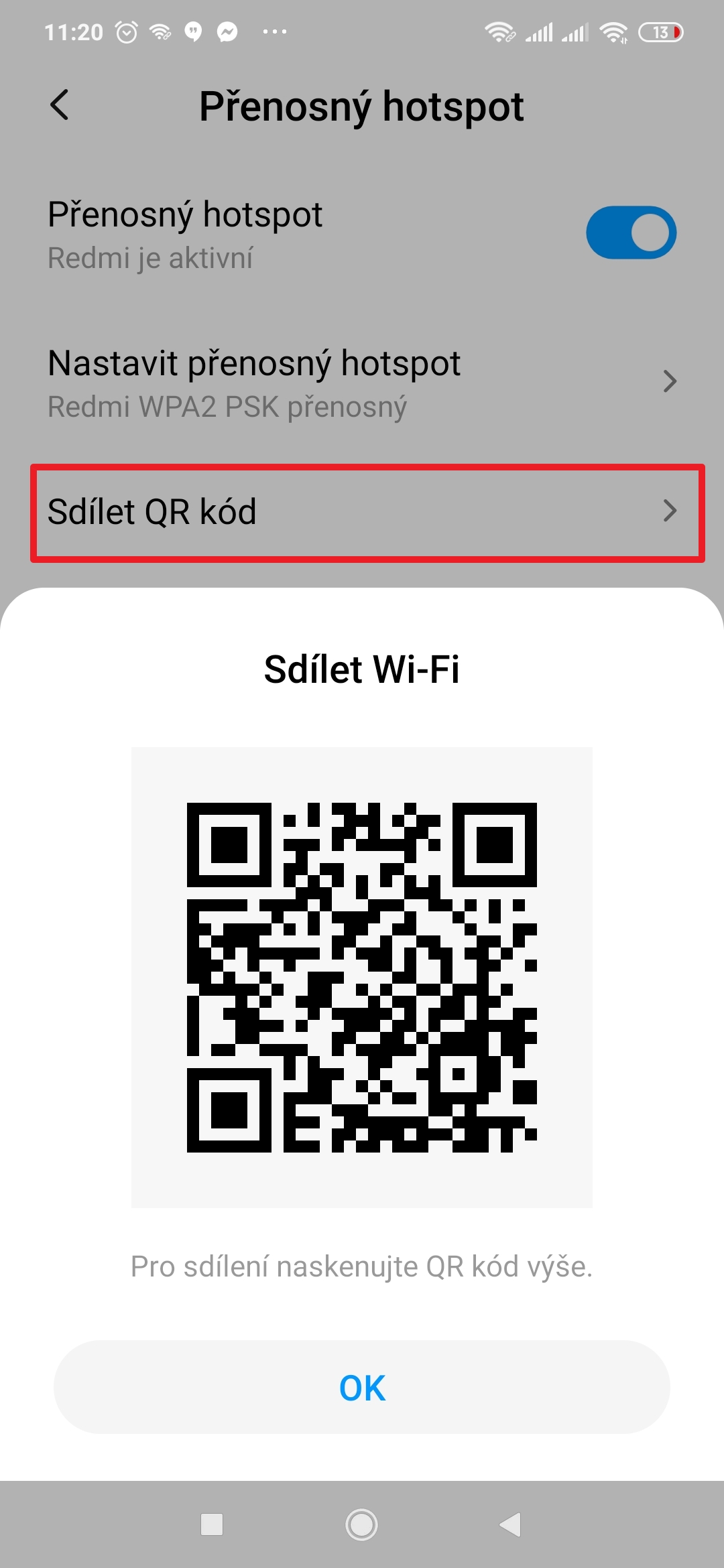 5. Zobrazí se QR kód, který po načtení dalším zařízením zajistí připojení bez nutnosti zadávání hesla (resp. heslo je zadáno automaticky).