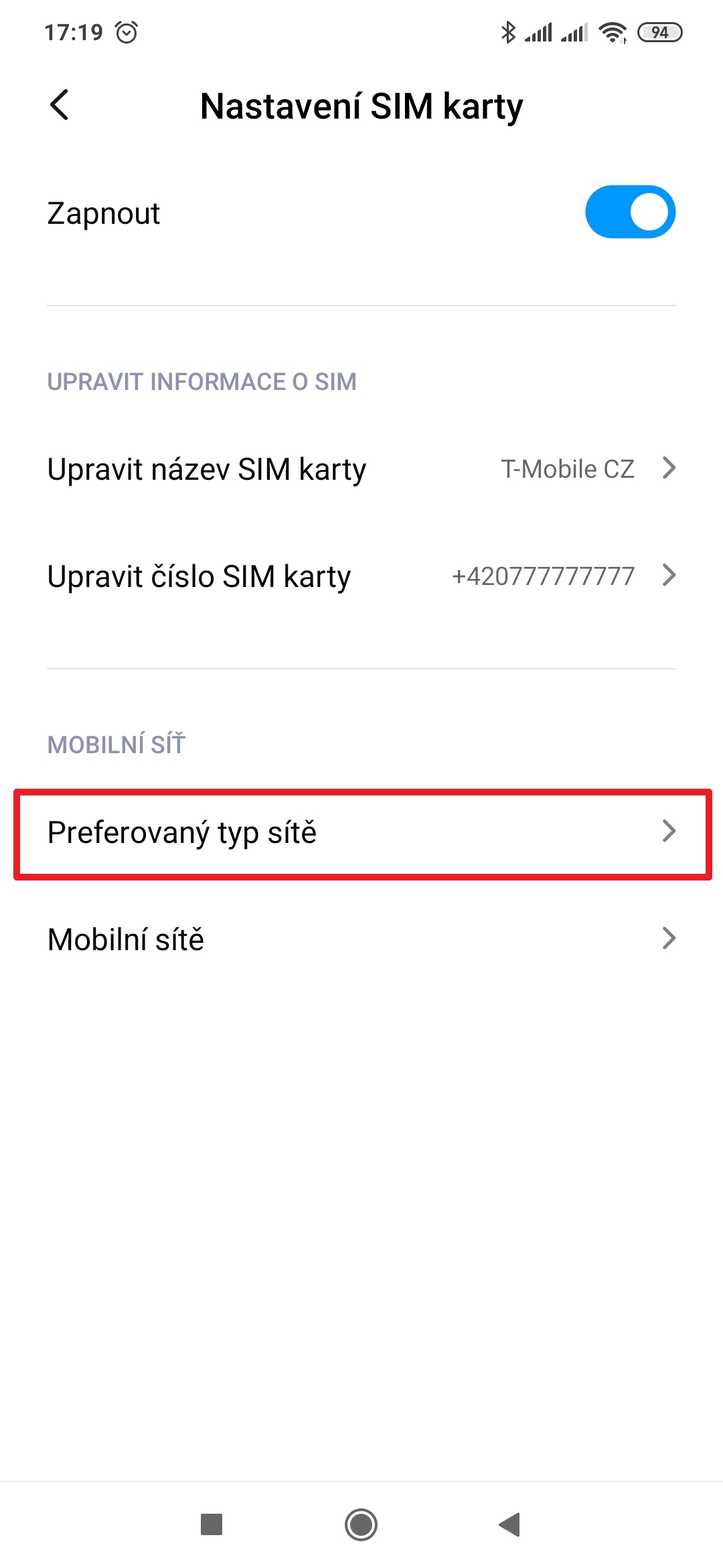 4. Klepněte na položku Preferovaný typ sítě.