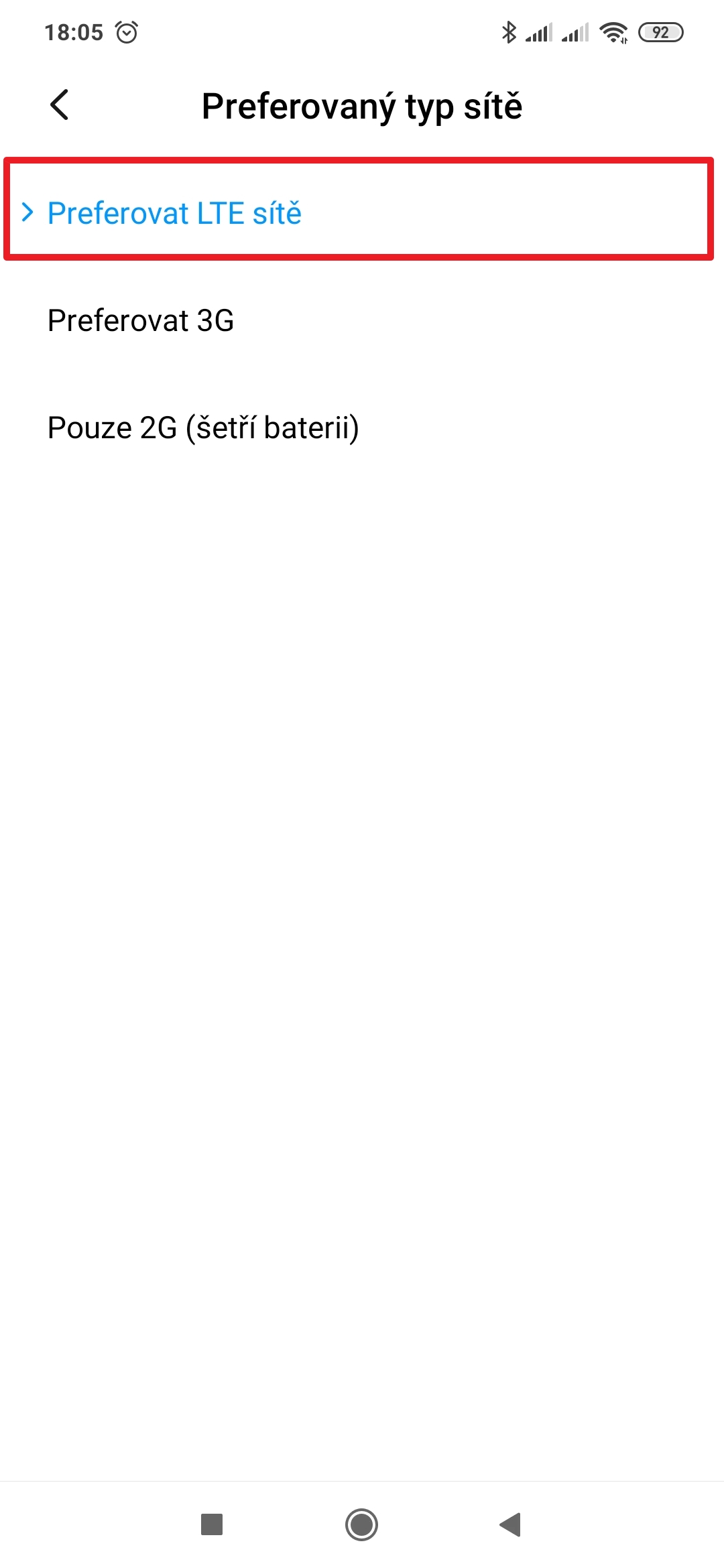 5. Zvolte jednu z nabízených možností – LTE/3G/2G.