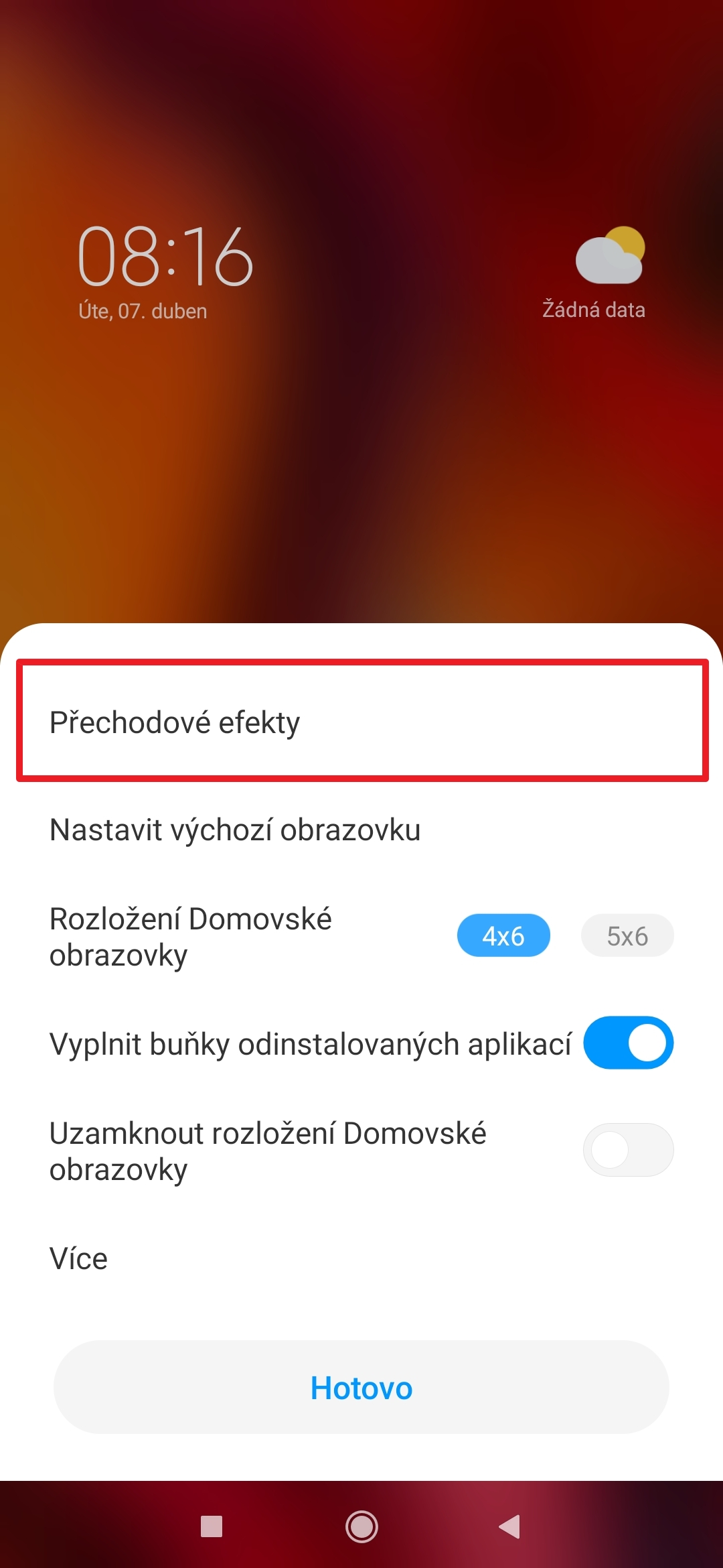 Když přepínáte mezi jednotlivými plochami domovské obrazovky, je tento přechod doprovázen grafickým efektem. Jestliže se vám výchozí efekt nelíbí, je velmi jednoduché změnit ho za jiný.