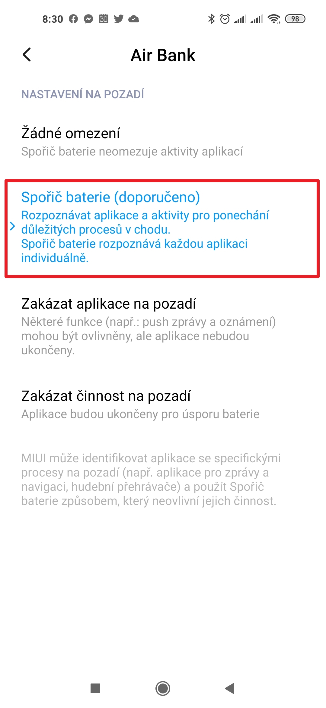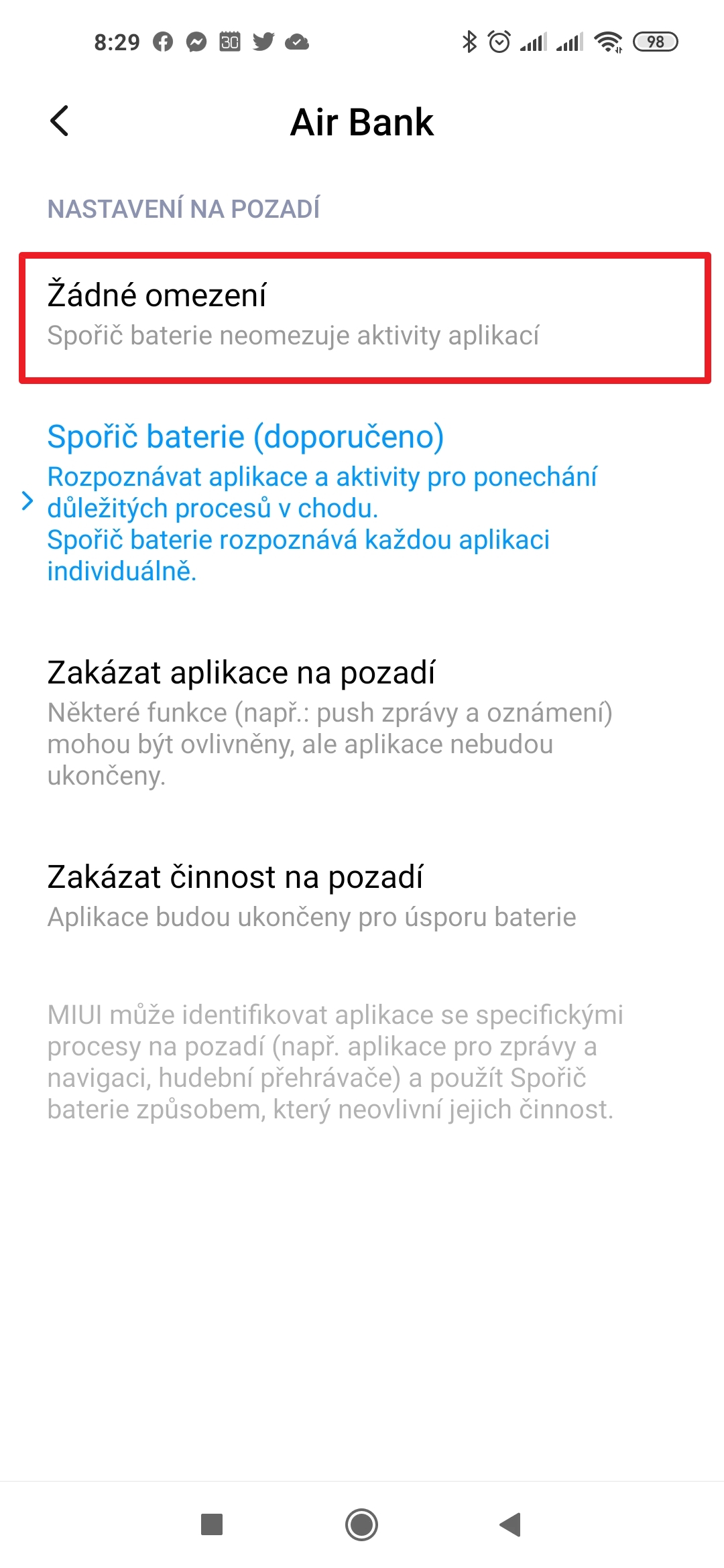 5. Na výběr jsou čtyři možnosti – výchozí bývá Spořič baterie, pokud však nechcete danou aplikaci omezovat, zvolte možnost Žádné omezení.