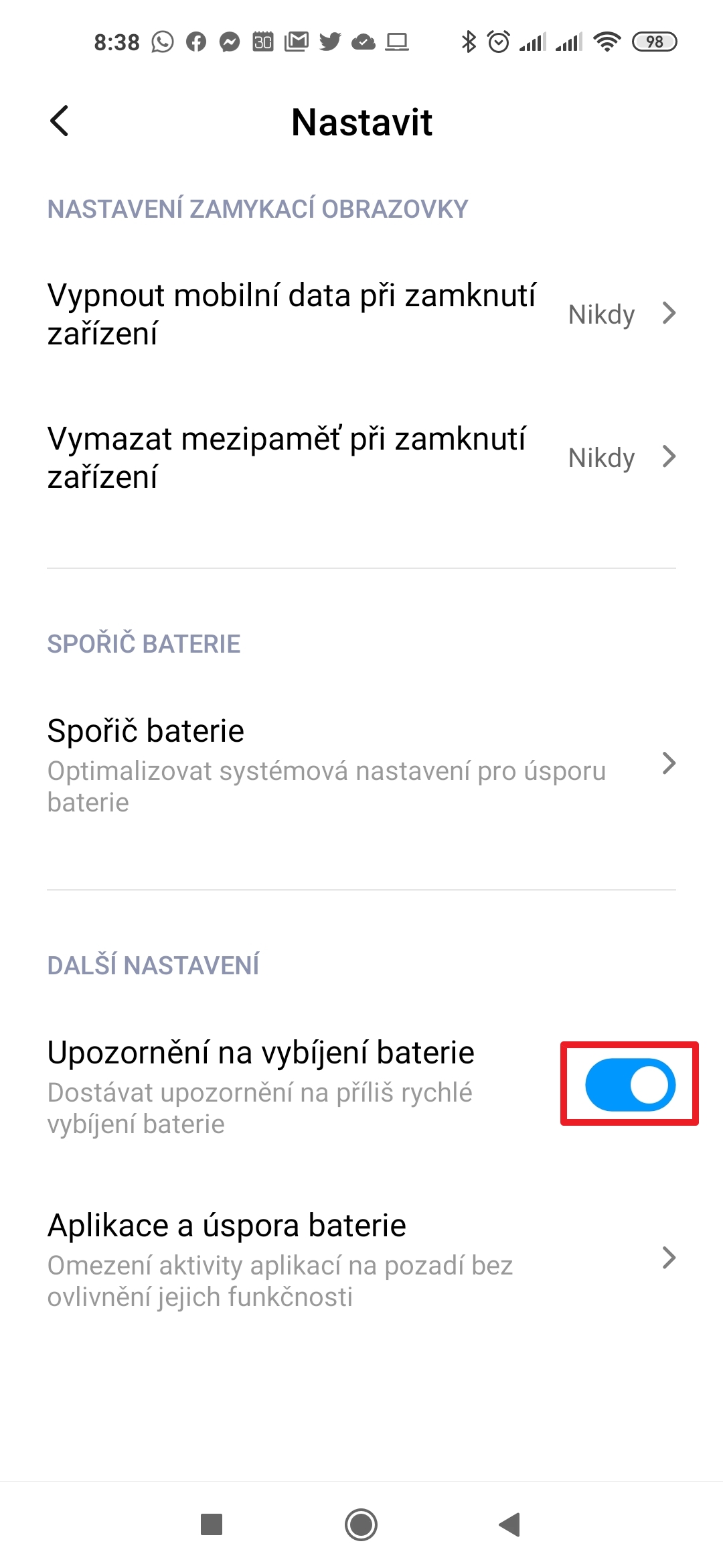 4. Pokud chcete být upozornění, jestliže nějaká aplikace spotřebovává moc energie, měla by být volba Upozornění na vybíjení baterie aktivní.