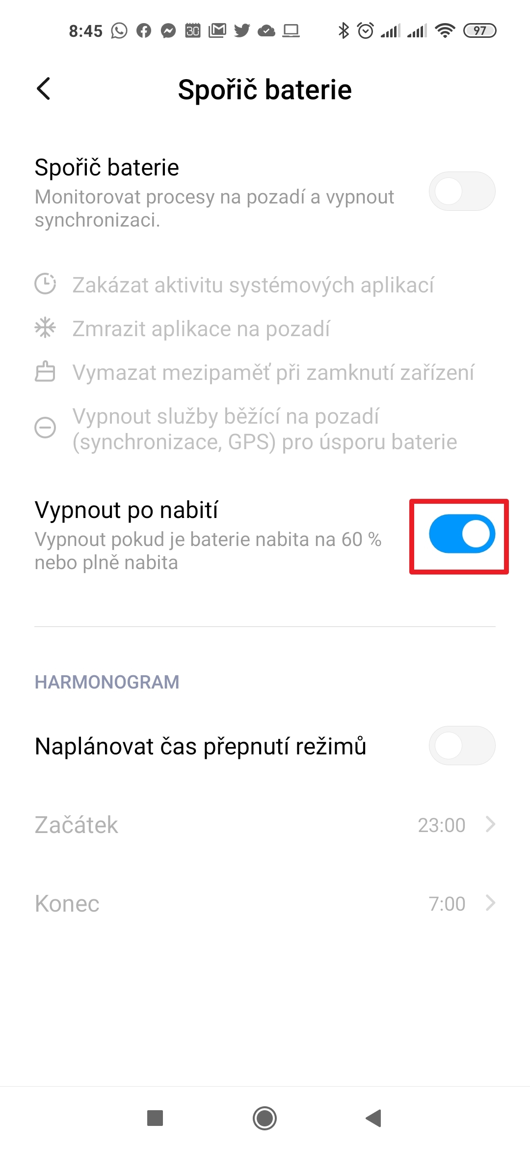 Po doplnění energie obvykle není nutné nechávat Spořič baterie aktivní. Proto je vhodné, aby se automaticky vypnul po dosažení určité úrovně nabití. I na tuto možnost vývojáři MIUI mysleli a nabízejí ji v nastavení.