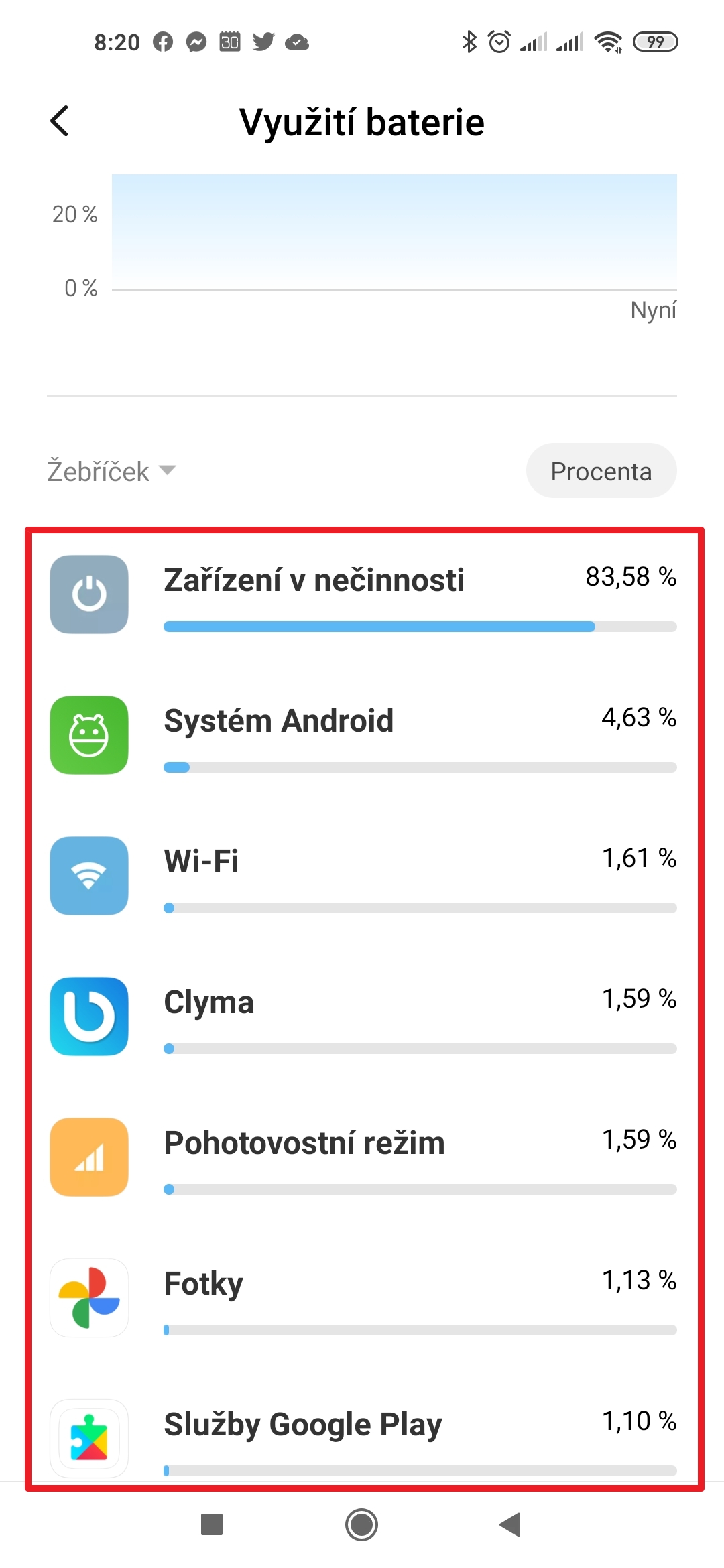 5. Níže je žebříček aplikací a komponent, seřazený podle toho, jak se podílejí na spotřebě baterie.