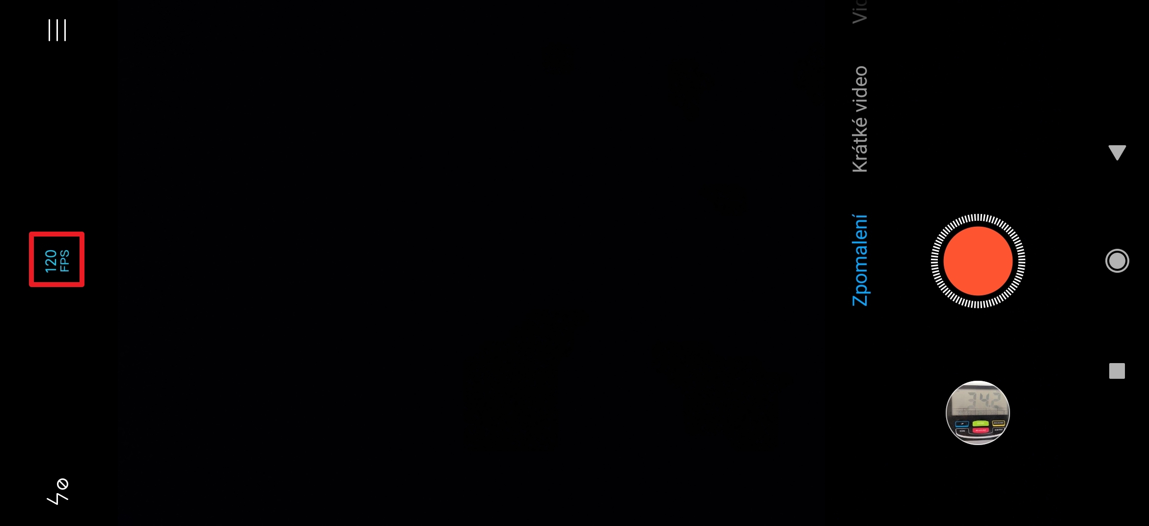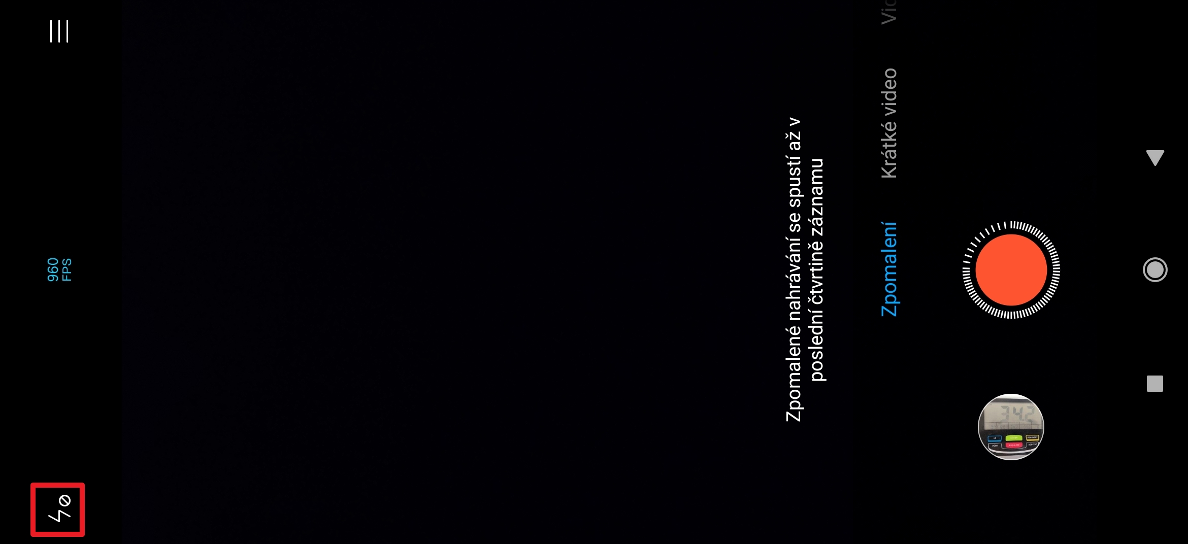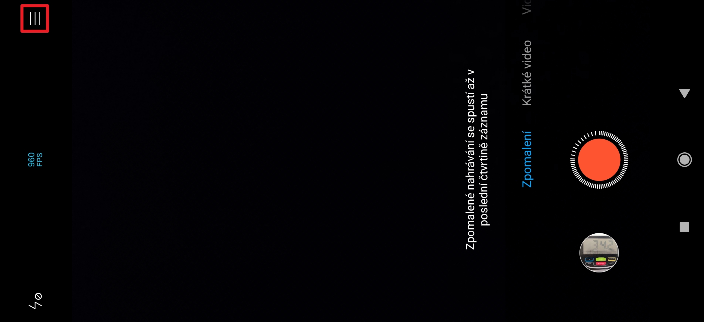 - Opakováním klepáním se mění režim: 120/240/960 fps.