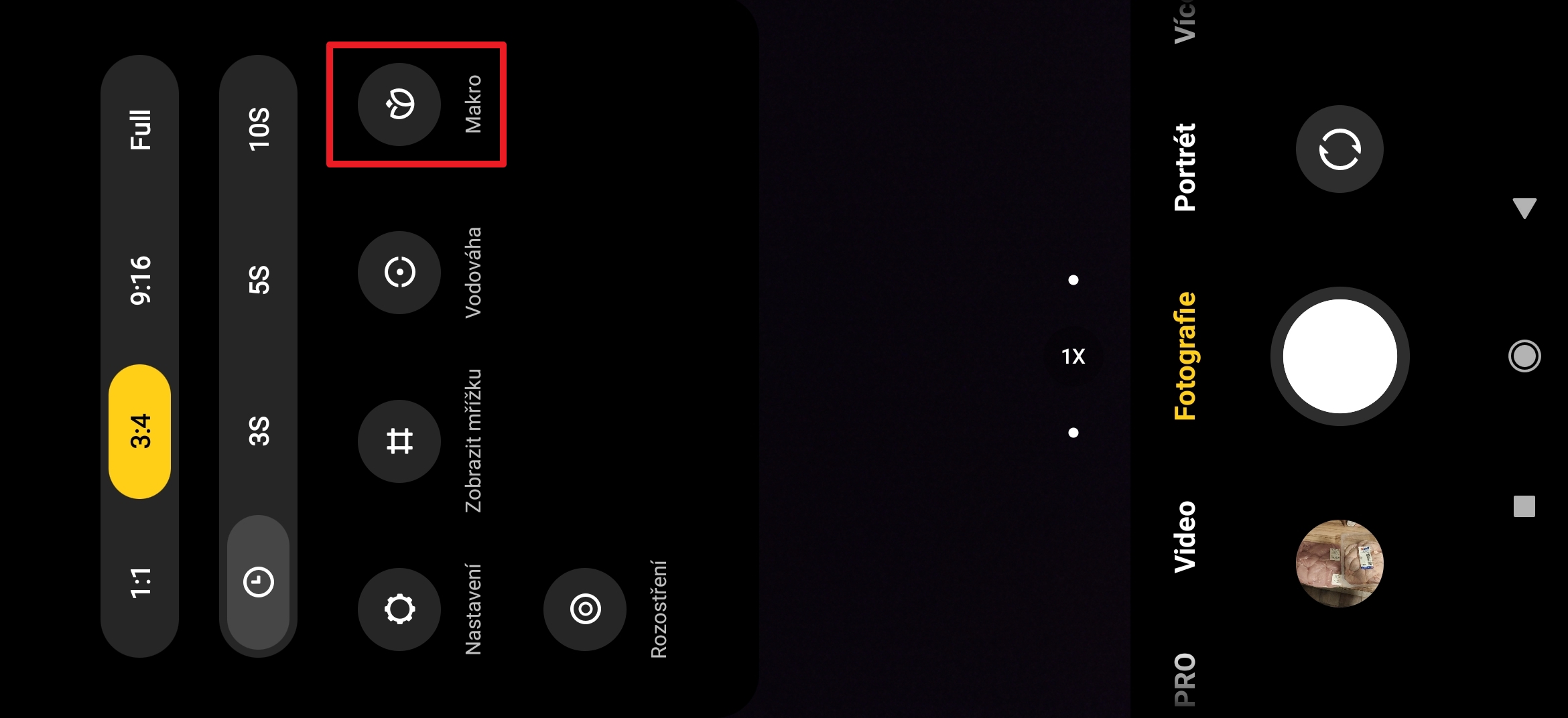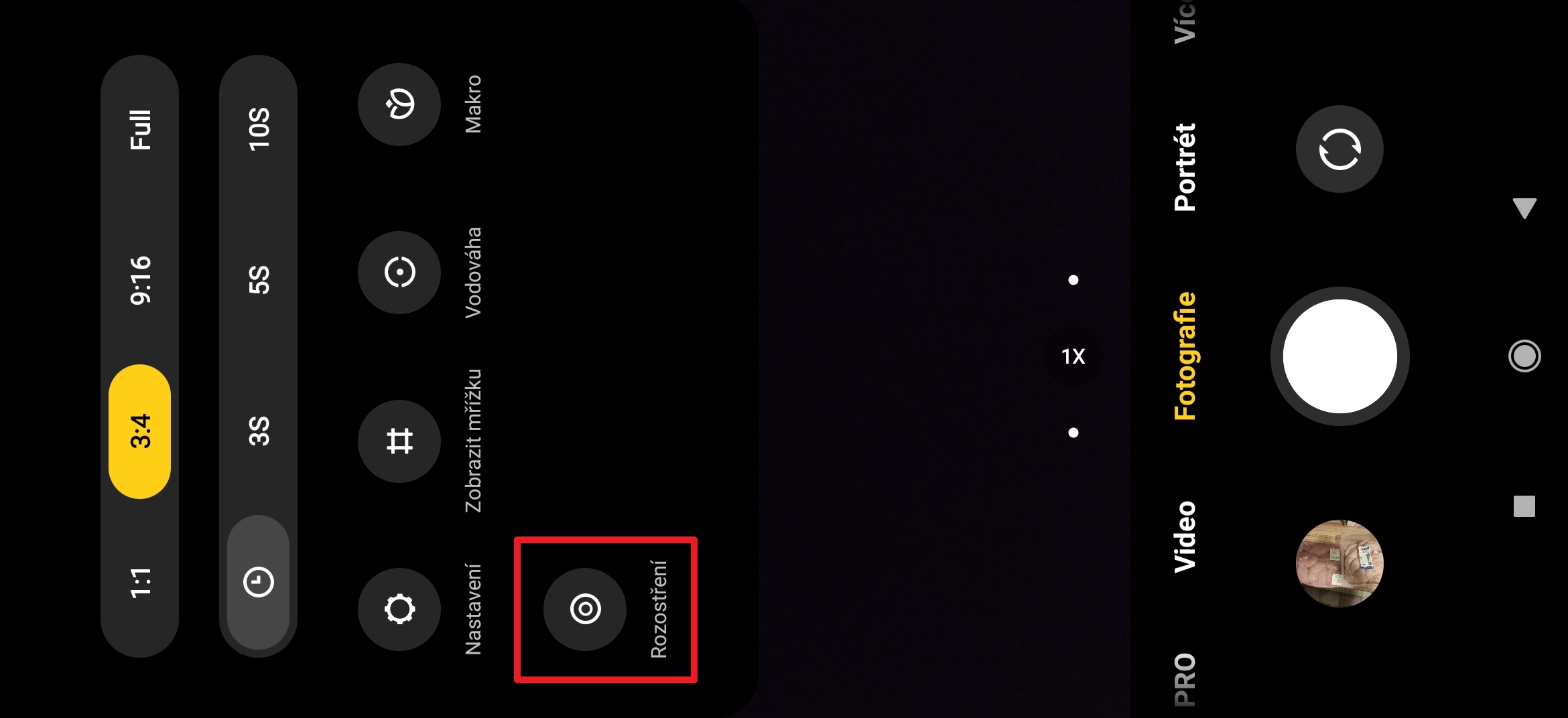 První volbou můžete měnit poměr stran fotografie. Výchozí je 3:4, avšak můžete zvolit čtverec (1:1), nebo širokoúhlý (9:16). Nutno podotknout, že většina hlavních snímačů má nativní poměr stran 3:4 a jakékoli další režimy dělá prostým výřezem z pořízeného snímku, což může mít negativní vliv na kvalitu fotky. Tu samou operaci můžete provést na počítači v grafickém editoru.