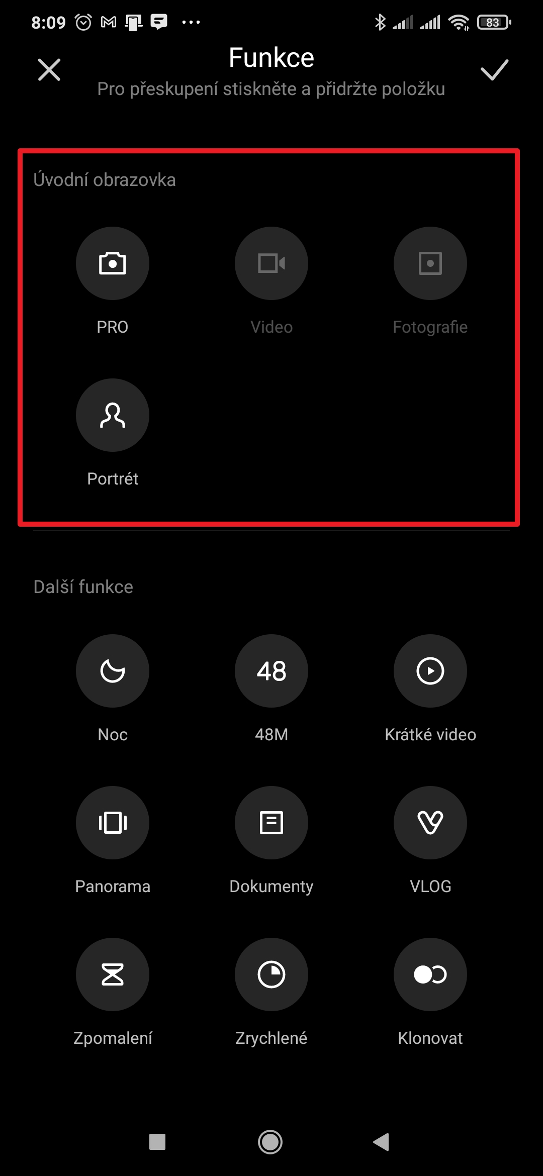 - Volby, které chcete mít rychle dostupné v nabídce režimů přesuňte prstem ze sekce Další funkce do sekce Úvodní obrazovka.