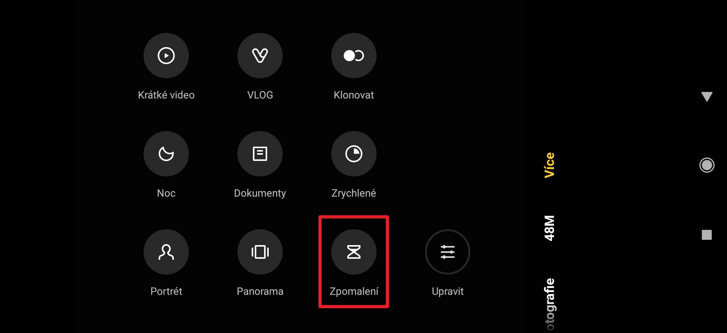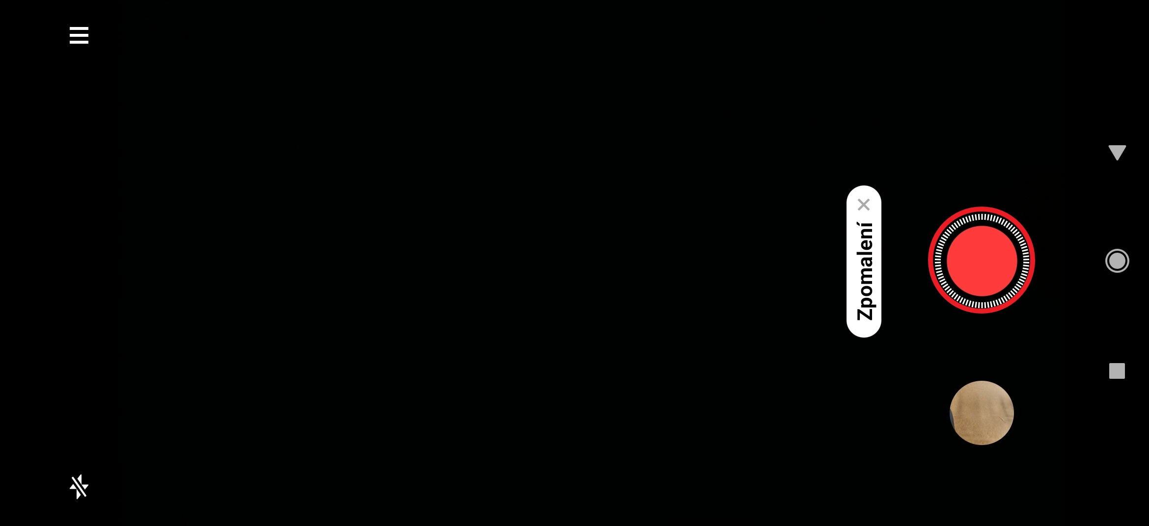 - Zpomalení (zpomalené video – možnosti zpomalení, respektive snímkovací frekvence a rozlišení se mohou lišit v závislosti na telefonu)