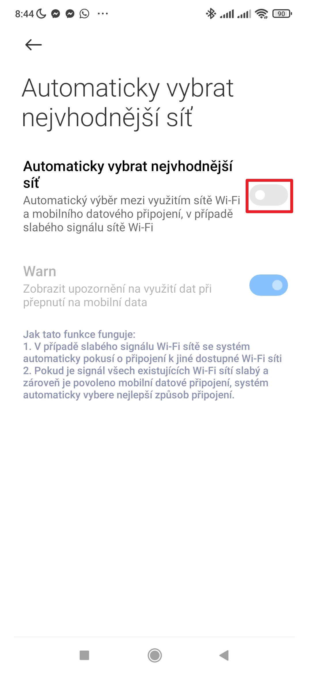 - Otevřete položku Automaticky vybrat nejvhodnější síť a deaktivujte přepínač Automaticky vybrat nejvhodnější síť.