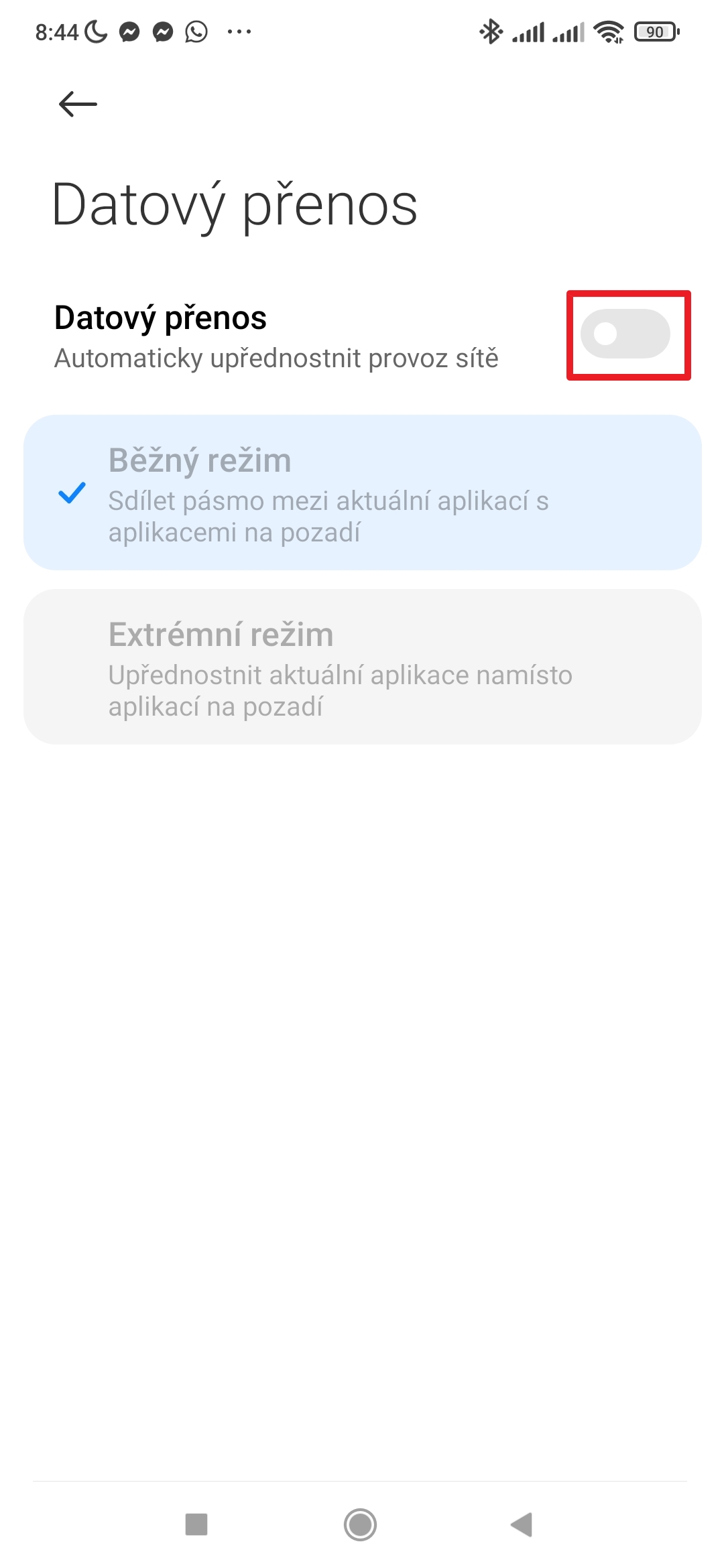 - Vraťte se o krok zpět a u položky Datový přenos deaktivujte přepínač Datový přenos.