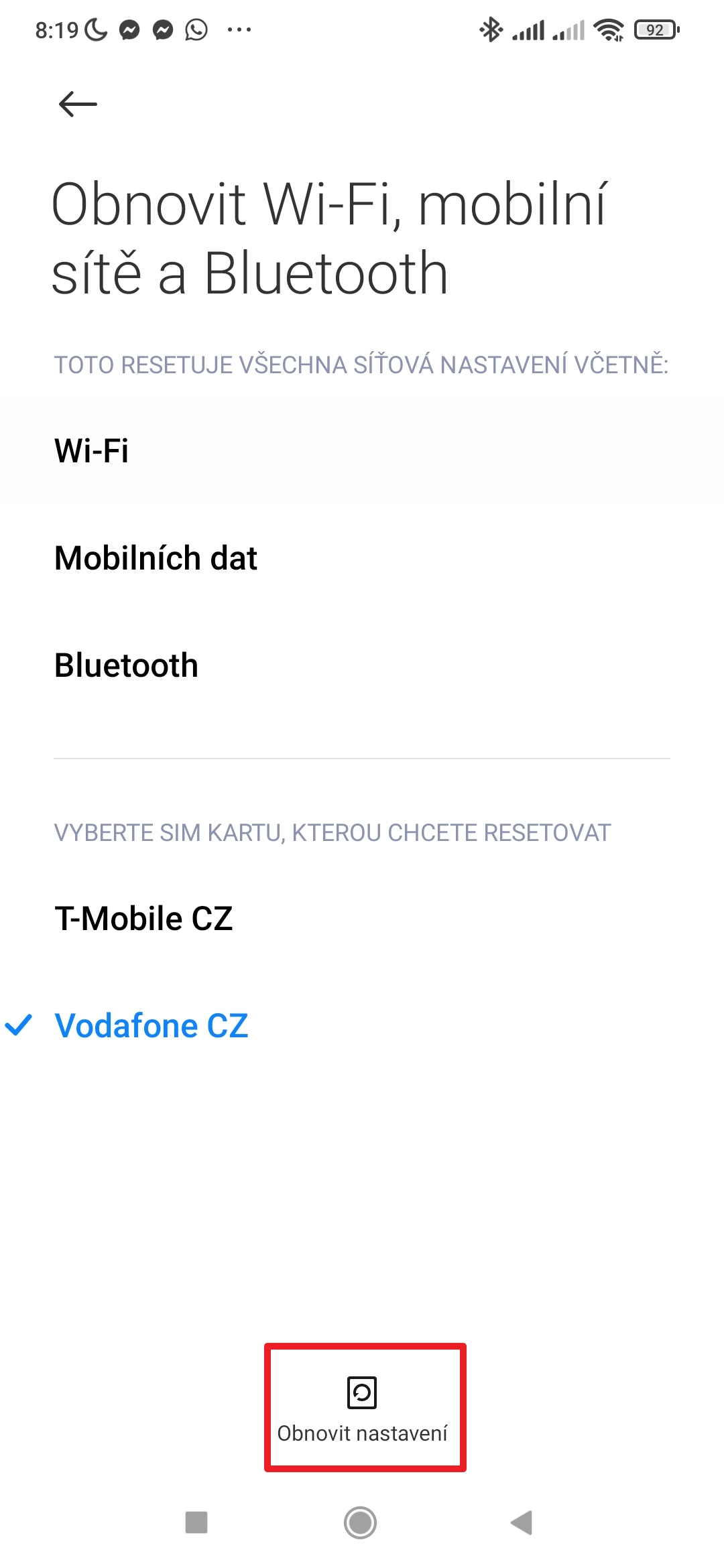 - Otevřete sekci Obnovit Wi-Fi, mobilní sítě a Bluetooth.