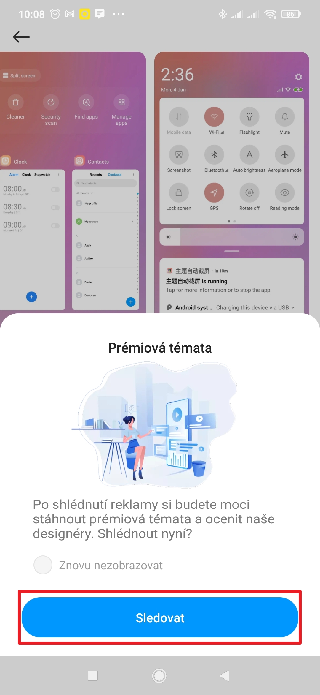Většinou se při spuštění aplikace Témata nejprve zobrazí reklama přes celou obrazovku, což je zbytečně otravné. Naštěstí není problém tuto možnost vypnout. Musíme však upozornit, že deaktivací se nezbavíte nutnosti dívat se na reklamu při stahování prémiových témat.