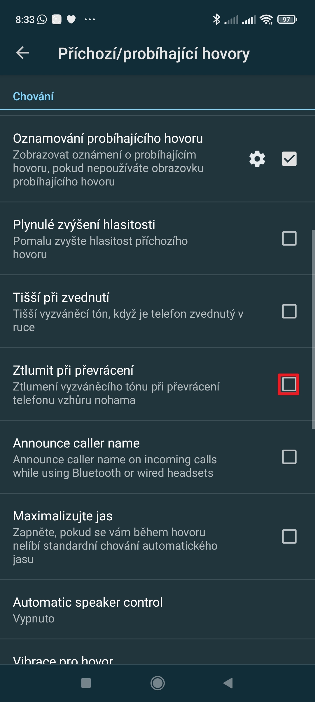Poměrně návyková funkce je ztišení vyzvánění příchozího hovoru otočením telefonu obrazovkou dolů. Je to rychlé, snadno proveditelné a zapamatovatelné gesto. Hovor se tím neodmítne – telefon pouze přestane zvonit. Nejprve je však nutné to povolit.