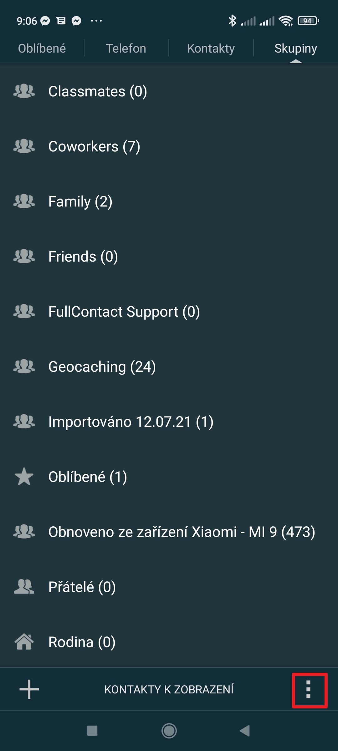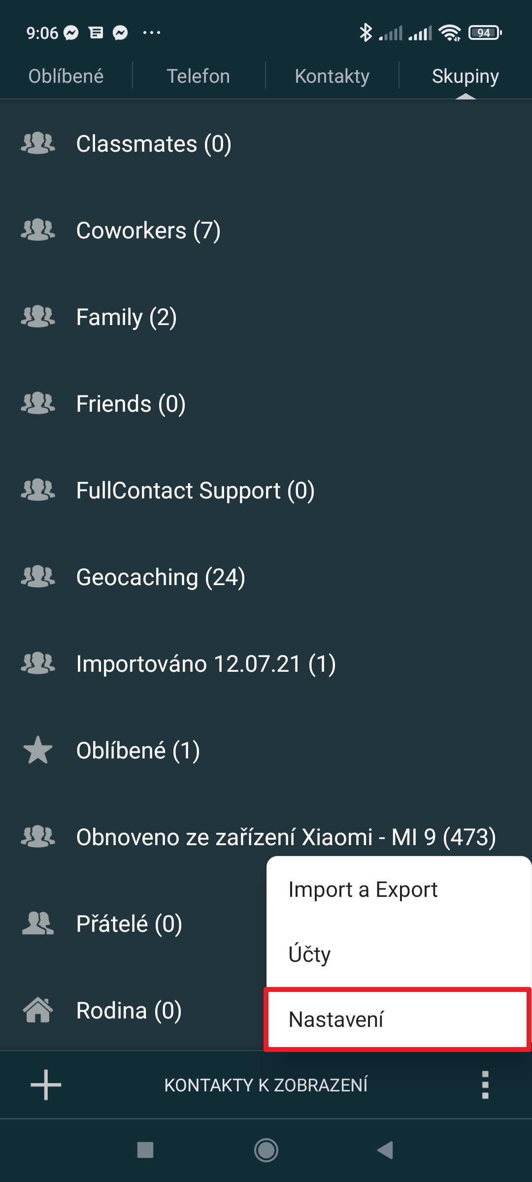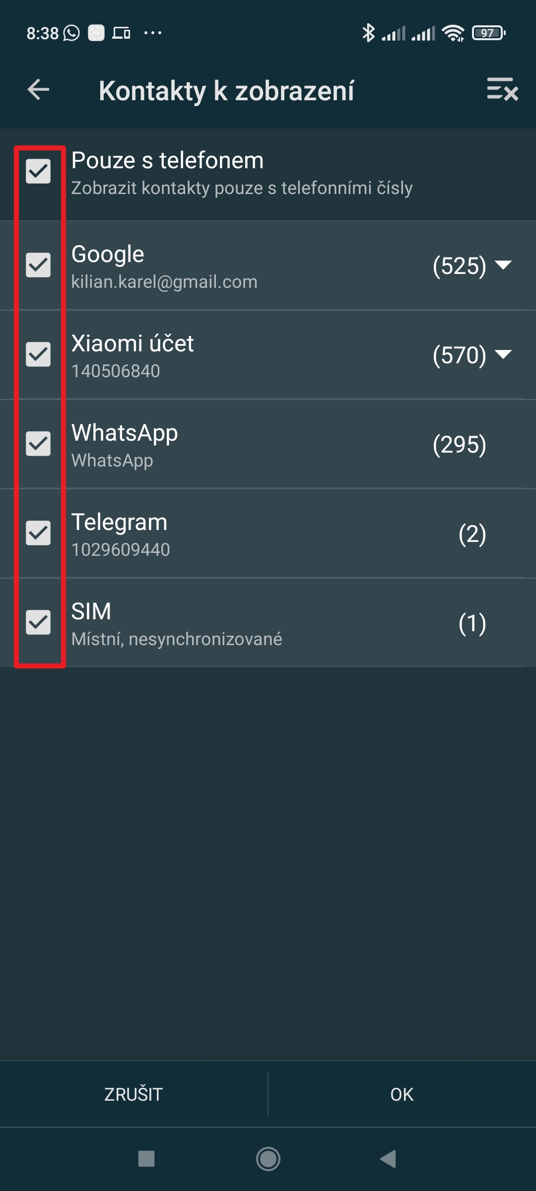 5. Pod položkou Kontakty k zobrazení můžete vybrat účty, ze kterých se mají používat kontakty.