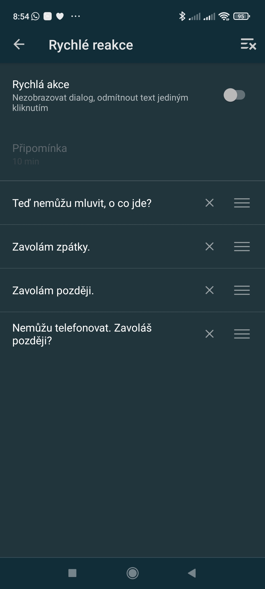 Ve výchozím stavu aplikace při příchozím hovoru nabízí možnost přijmout, nebo odmítnout. Můžete si ale zapnout takzvané „rychlé reakce“, což je odmítnutí hovoru současně s odesláním krátké textové zprávy volajícímu.