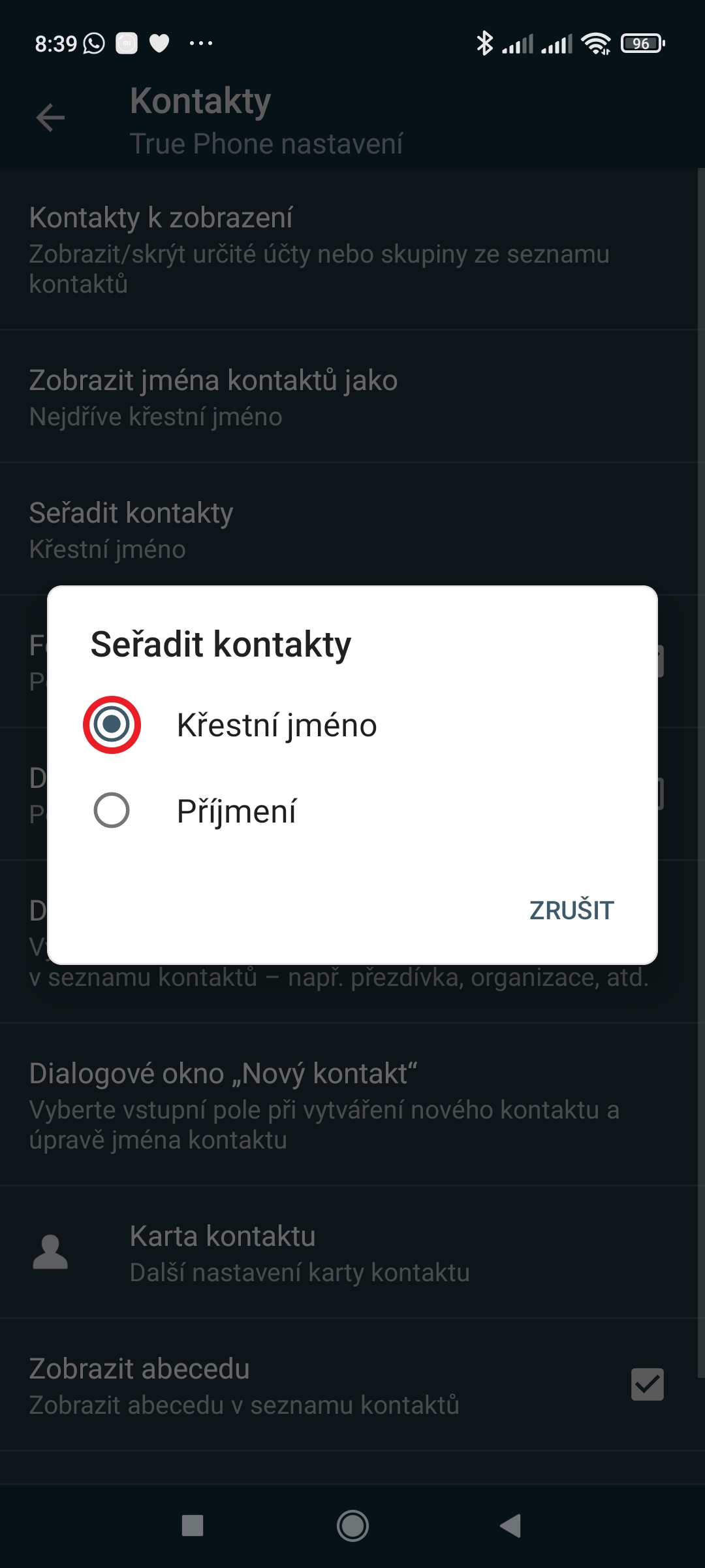 7. Volbou Seřadit kontakty můžete zvolit, zda se kontakty v seznamu mají řadit dle křestního jména, nebo příjmení.