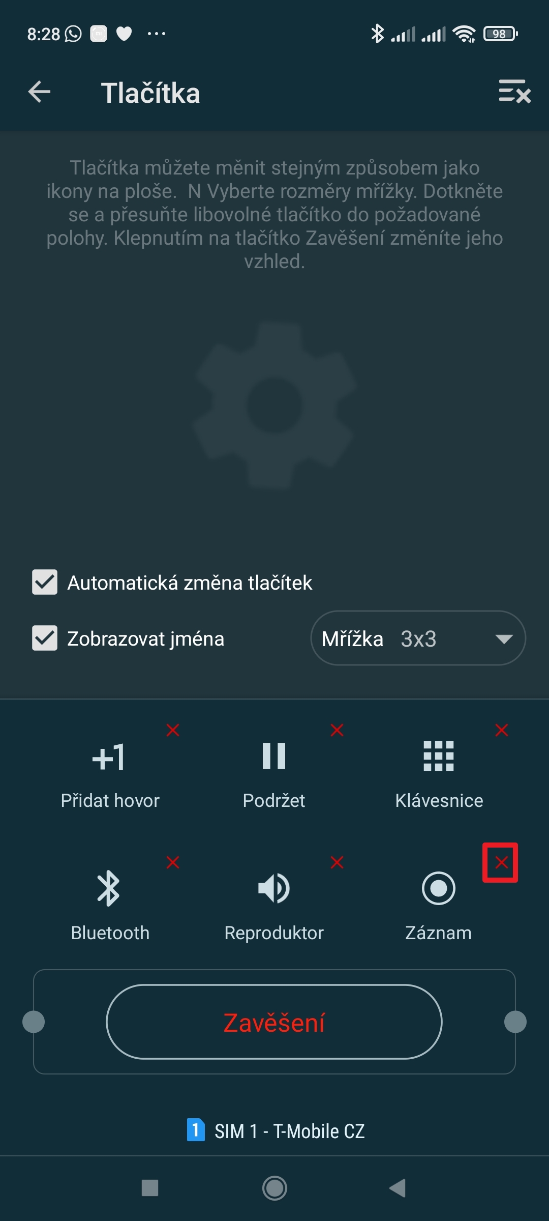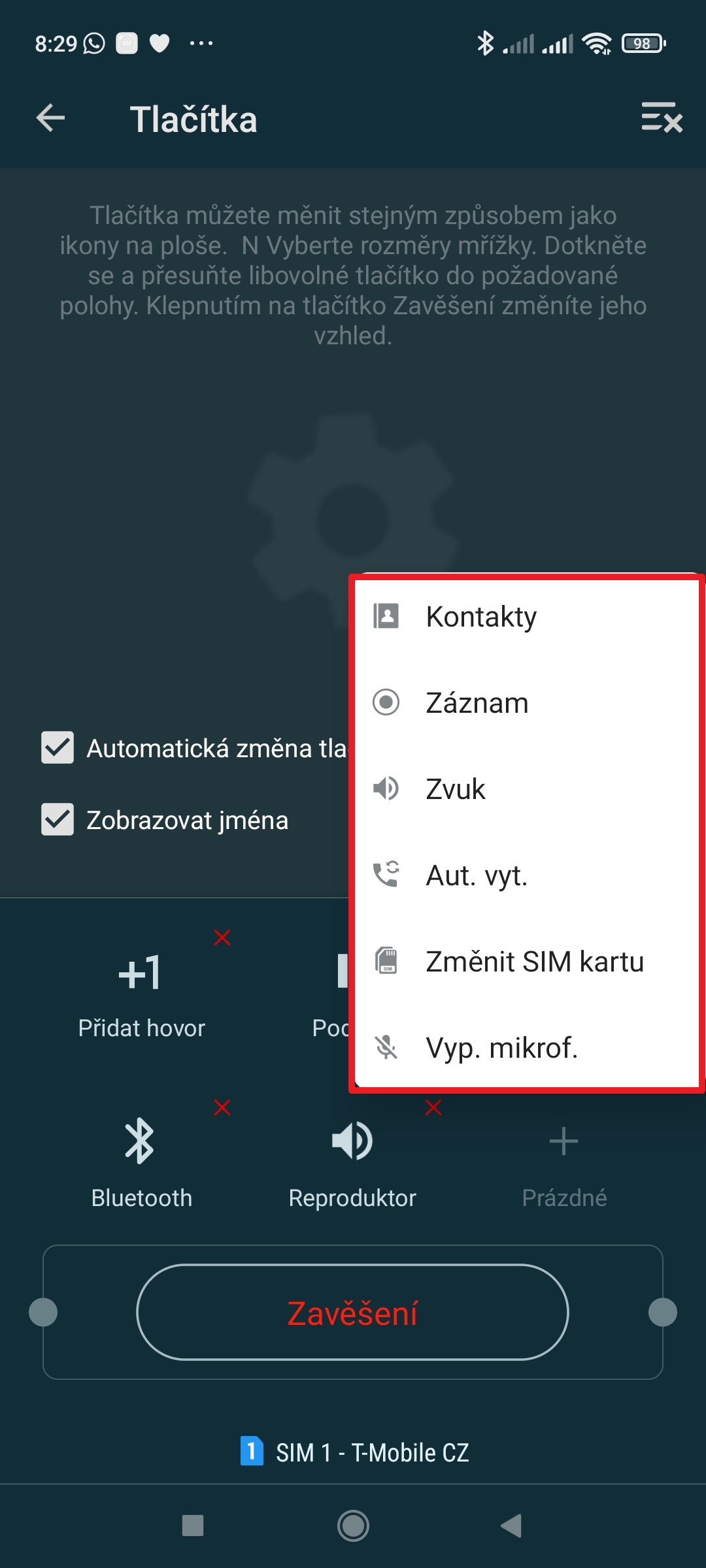 8. V sekci Tlačítka si můžete nastavit tlačítka, jež budou dostupná během hovoru.